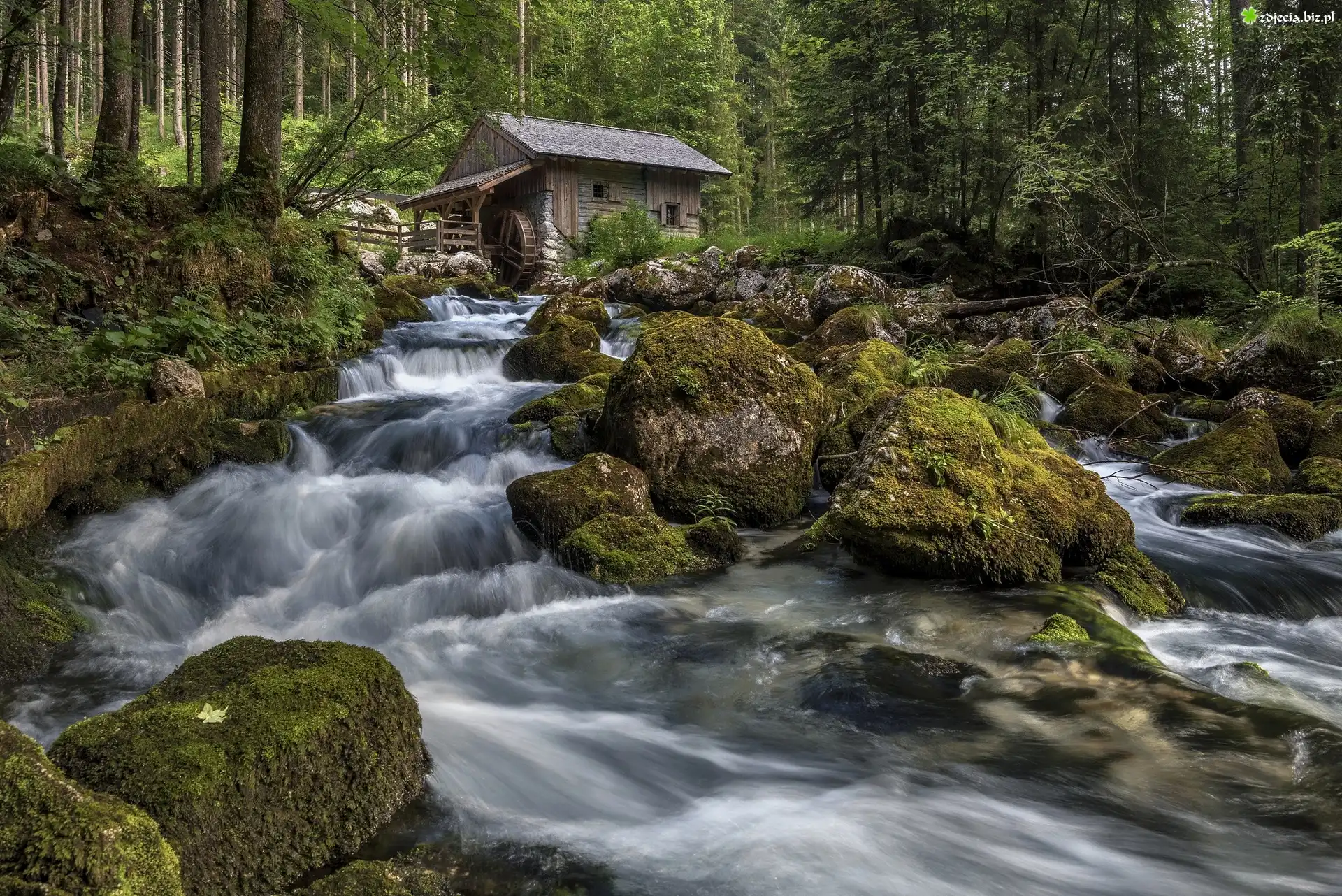 Zdjęcie Młyn wodny, Las, Drzewa, Rzeka, Omszałe, Kamienie