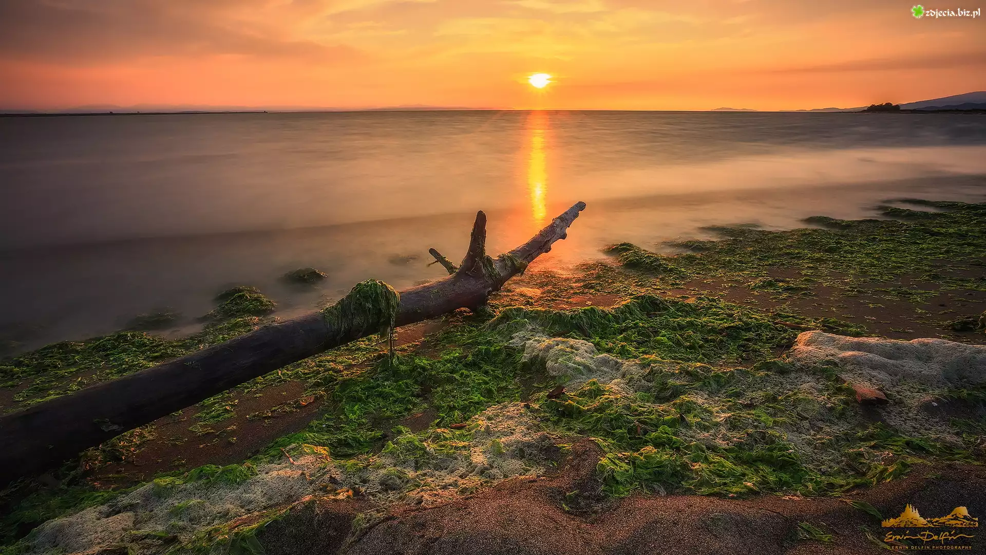 Zdjęcie Rzeka Fraser, Zachód słońca, Konar, Wodorosty, Iona Beach Regional Park, Richmond, Kanada |