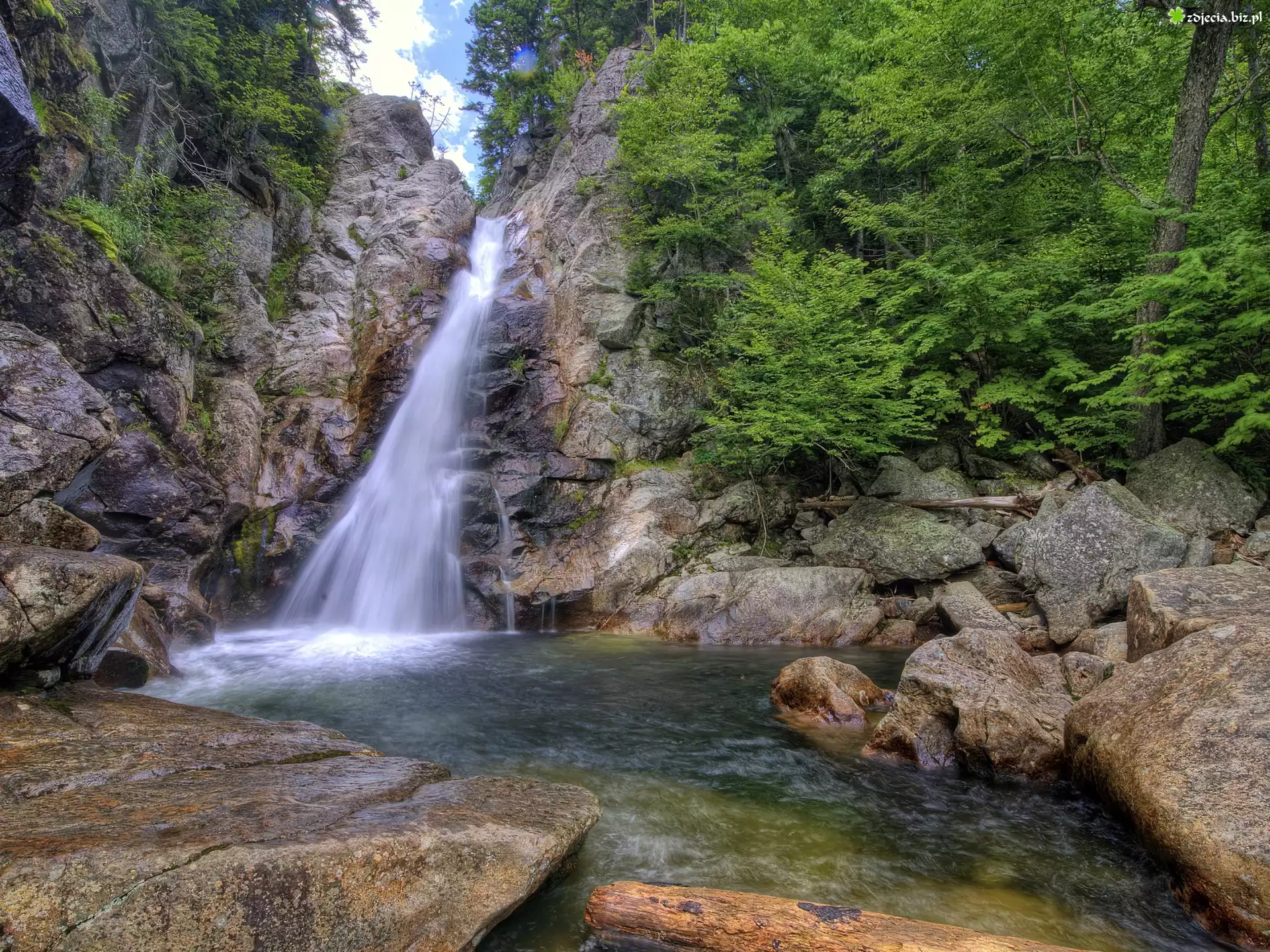 Zdjęcie Wodospad, Kamienie, Drzewa, Krzewy