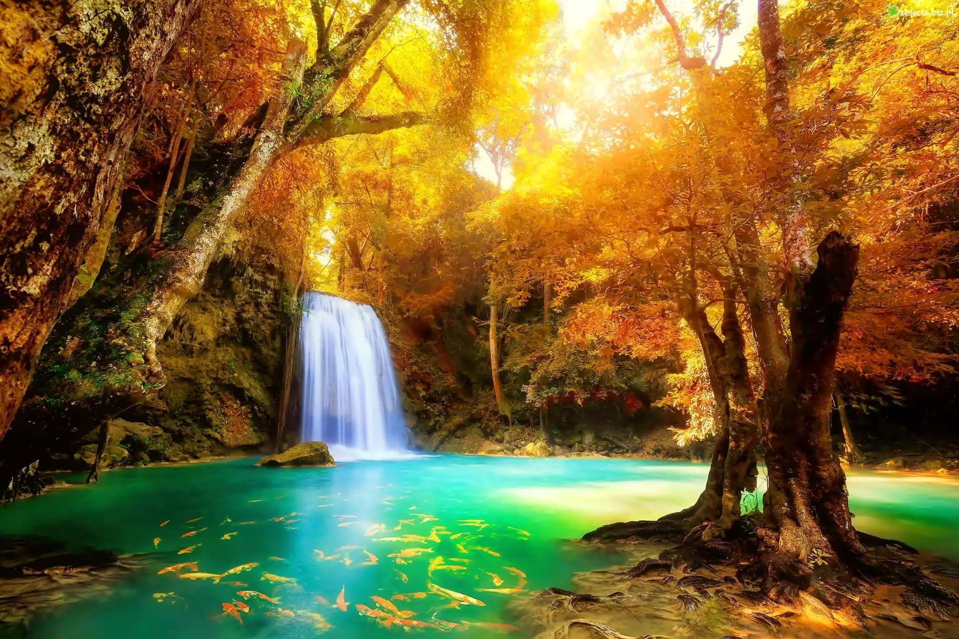Zdjęcie, Wodospad, Rzeka, Ryby, Drzewa, Jesień