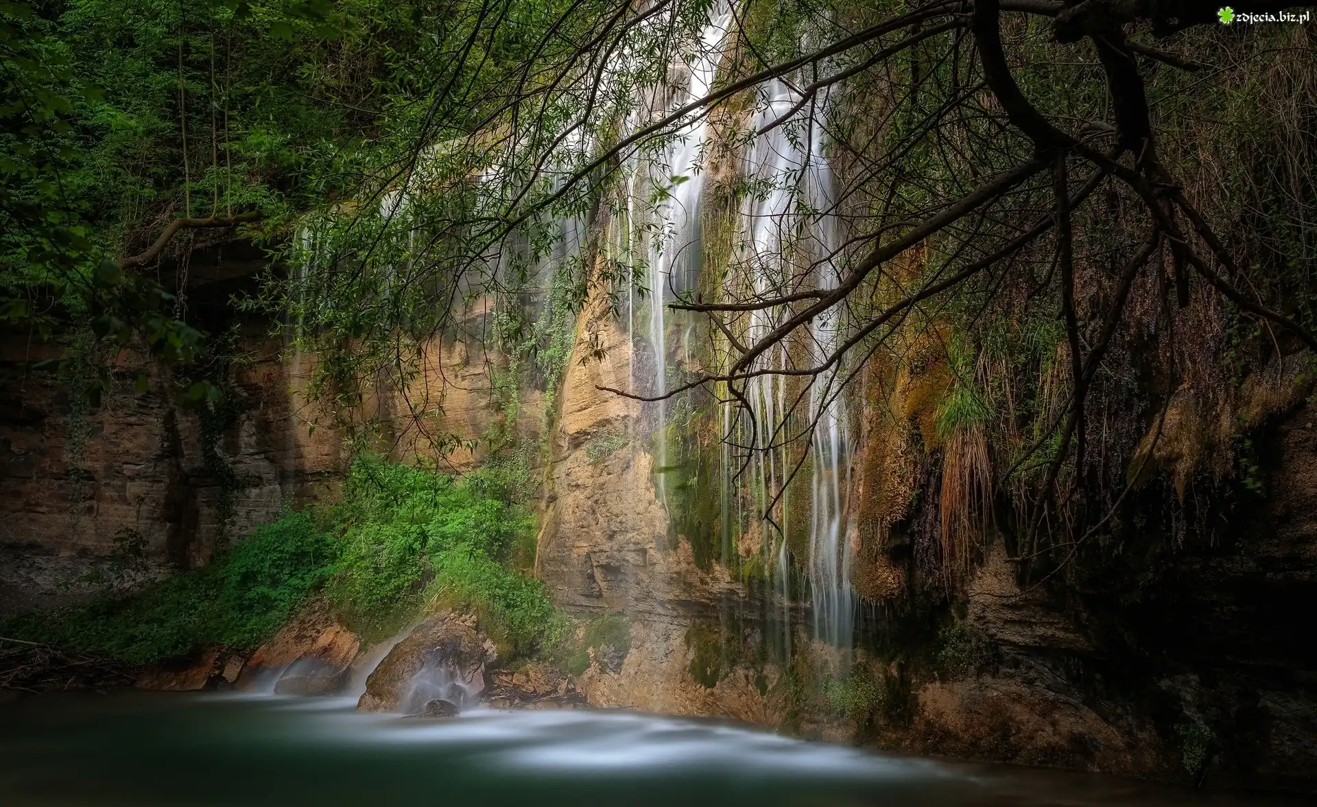 Zdjęcie, Wodospad, Skały, Drzewa, Rośliny
