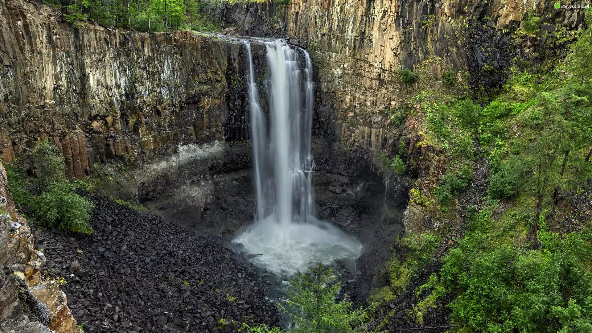 Zdjęcie Wodospad, Skały, Zielone, Drzewa, Rośliny