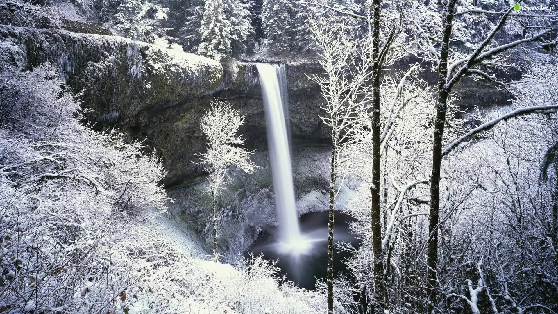 Zdjęcie, Wodospad, Las, Drzewa, Góry, Zima