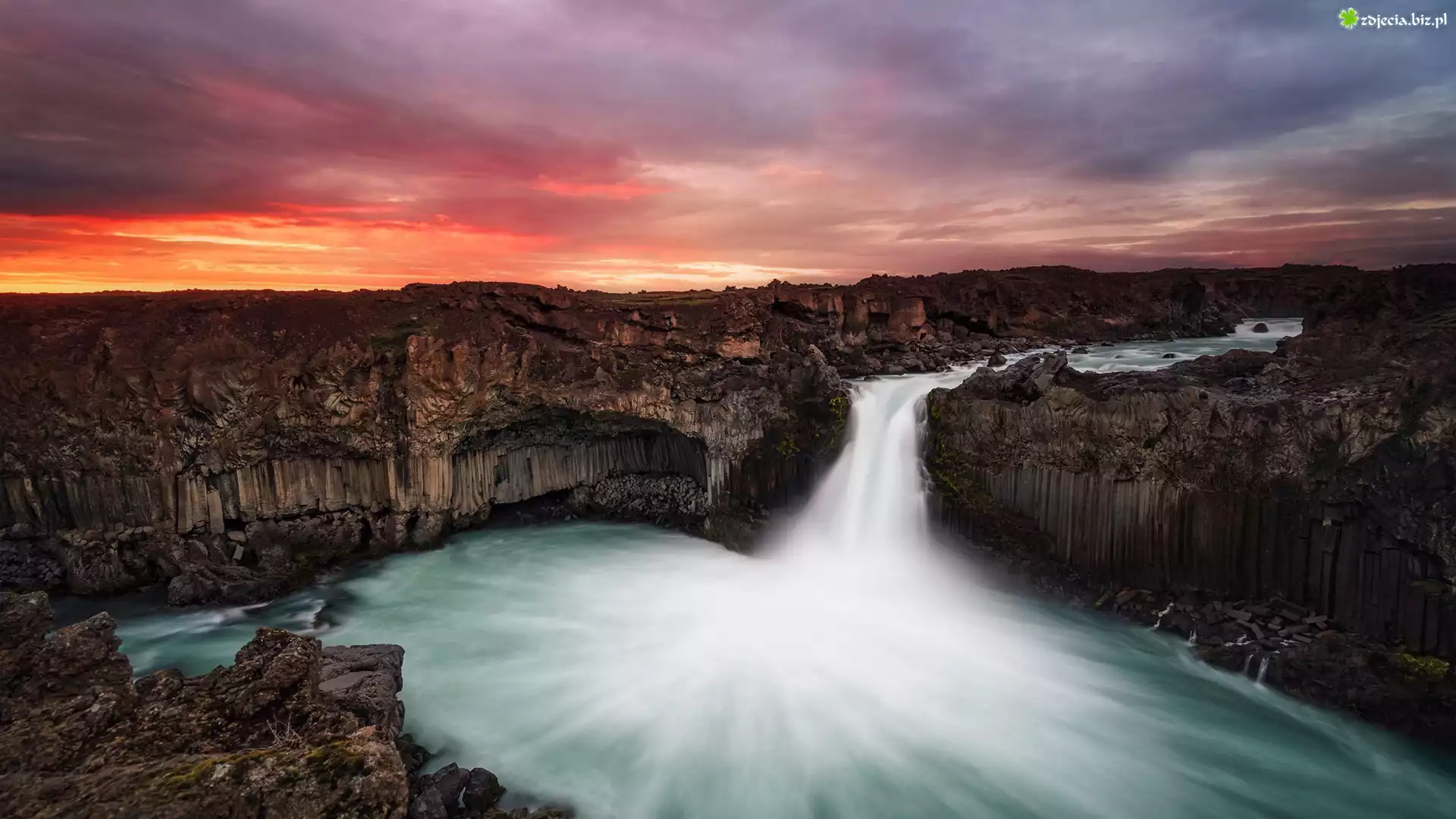 Zdjęcie, Islandia, Wodospad Aldeyjarfoss, Skały, Bazaltowe, Zachód słońca