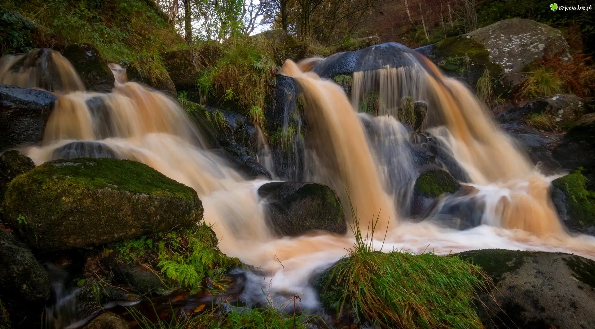 Zdjęcie, Wodospad, Omszałe, Kamienie, Roślinność