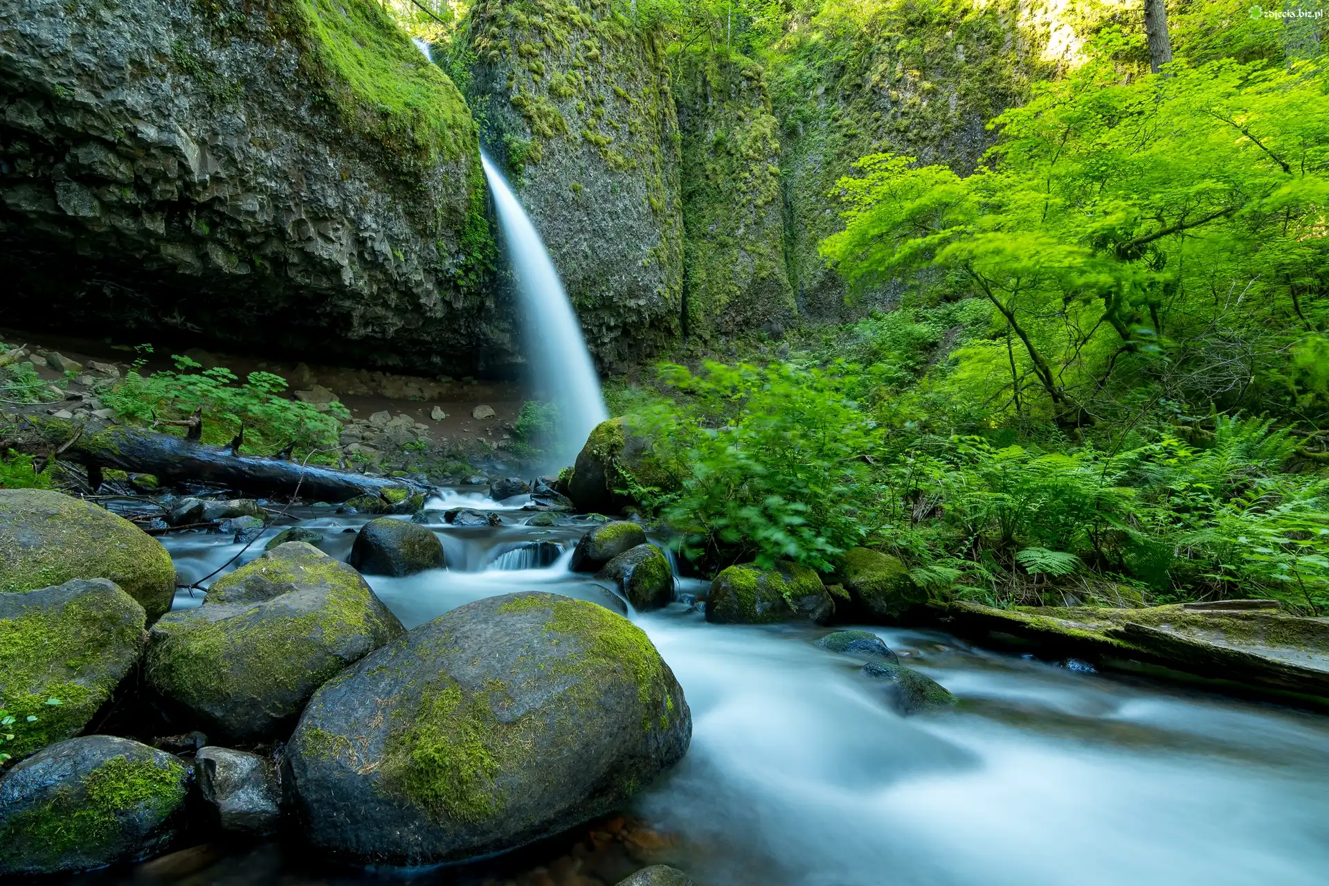 Zdjęcie Wodospad, Rzeka, Omszałe, Kamienie, Drzewa
