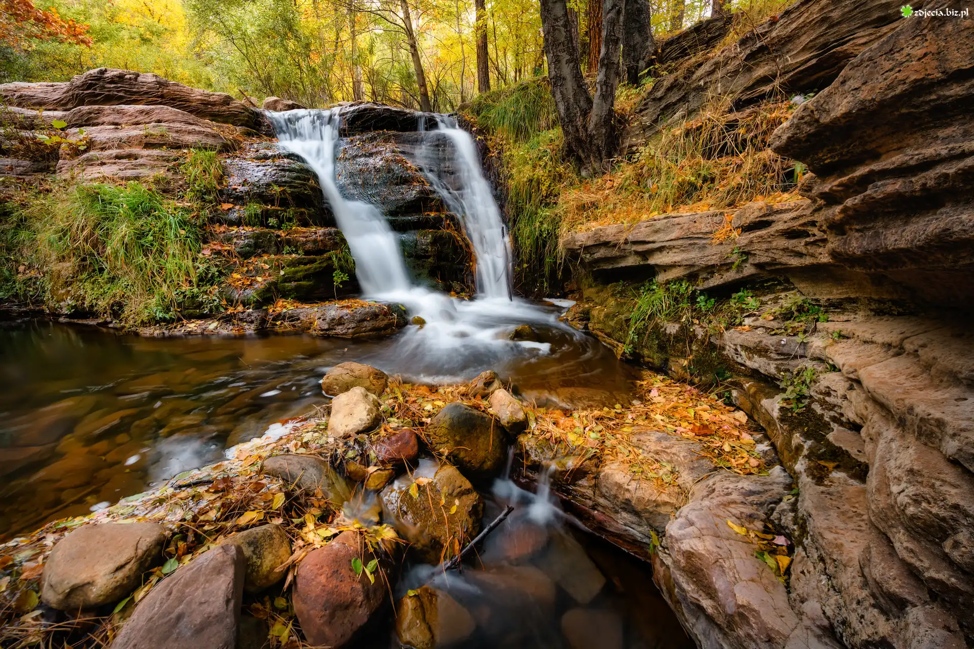 Zdjęcie Wodospad, Rzeka, Skały, Kamienie, Rośliny