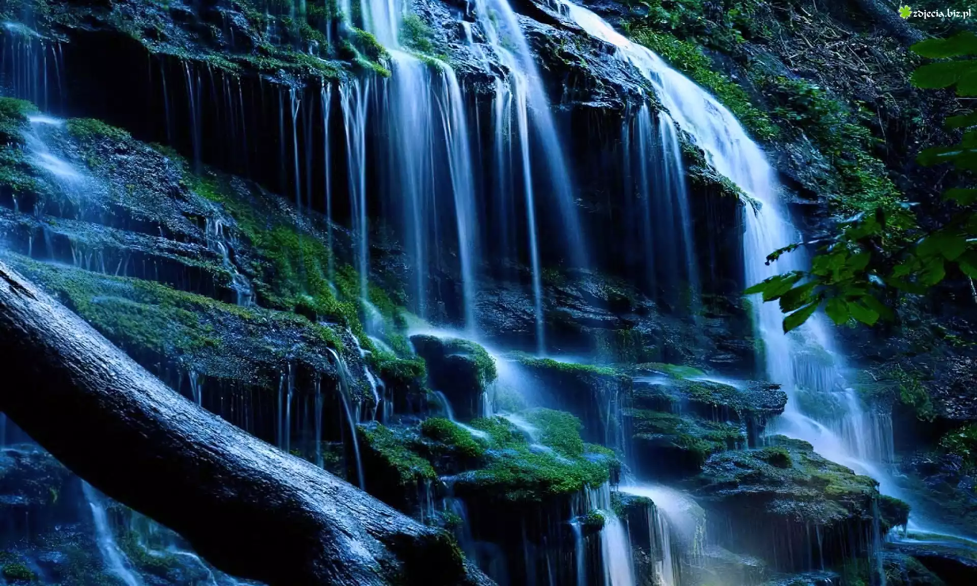 Zdjęcie Wodospad, Nocą, Mchy, Konar, Drzewa