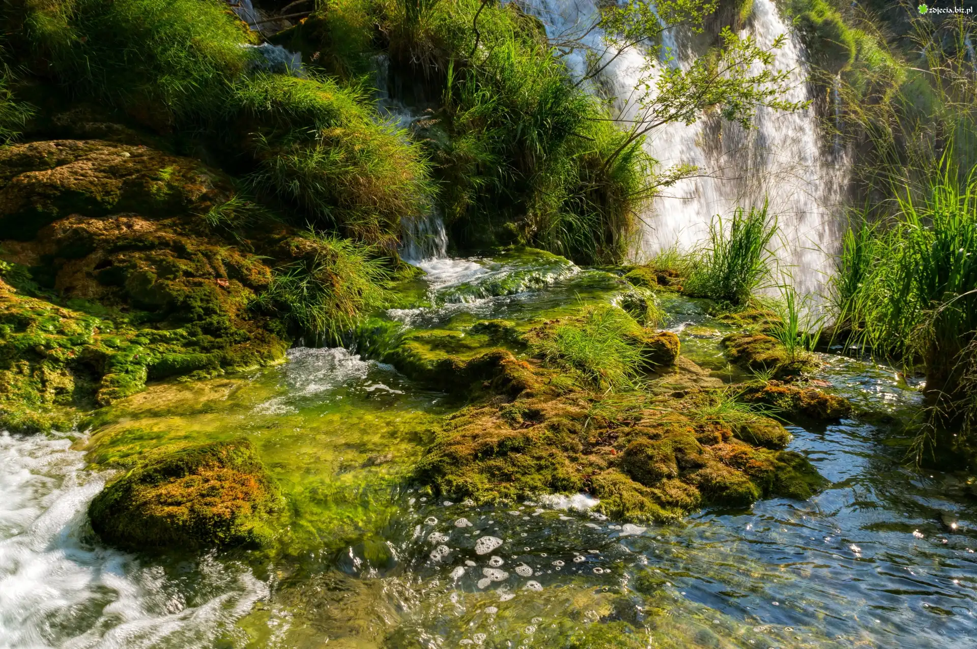 Zdjęcie, Wodospad, Kaskady, Krzewy, Mech