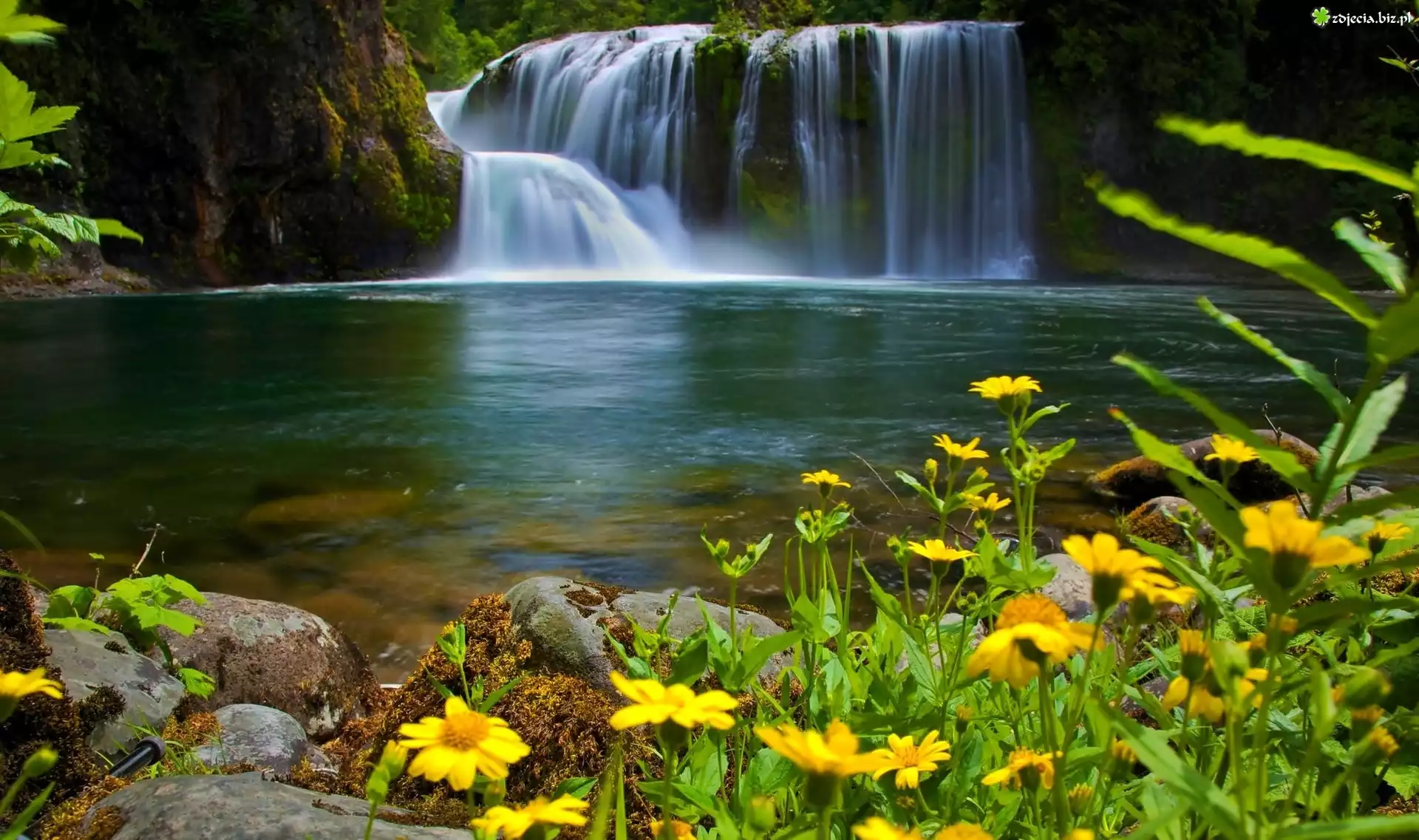 Zdjęcie Wodospad, Rzeka, Skały, Las, Kwiaty, Wiosna