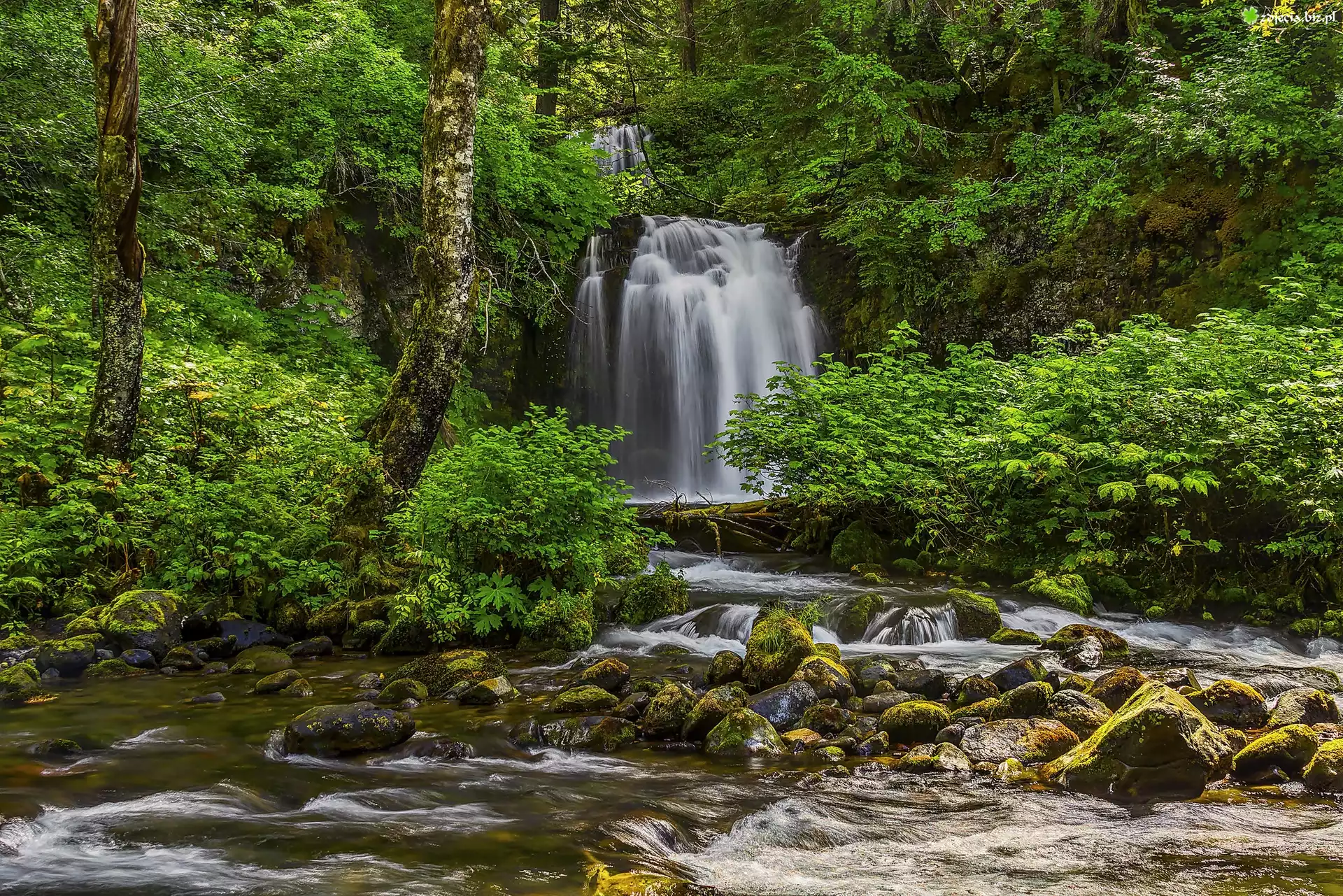 Zdjęcie Wodospad, Rzeka, Kamienie, Drzewa, Las, Rośliny