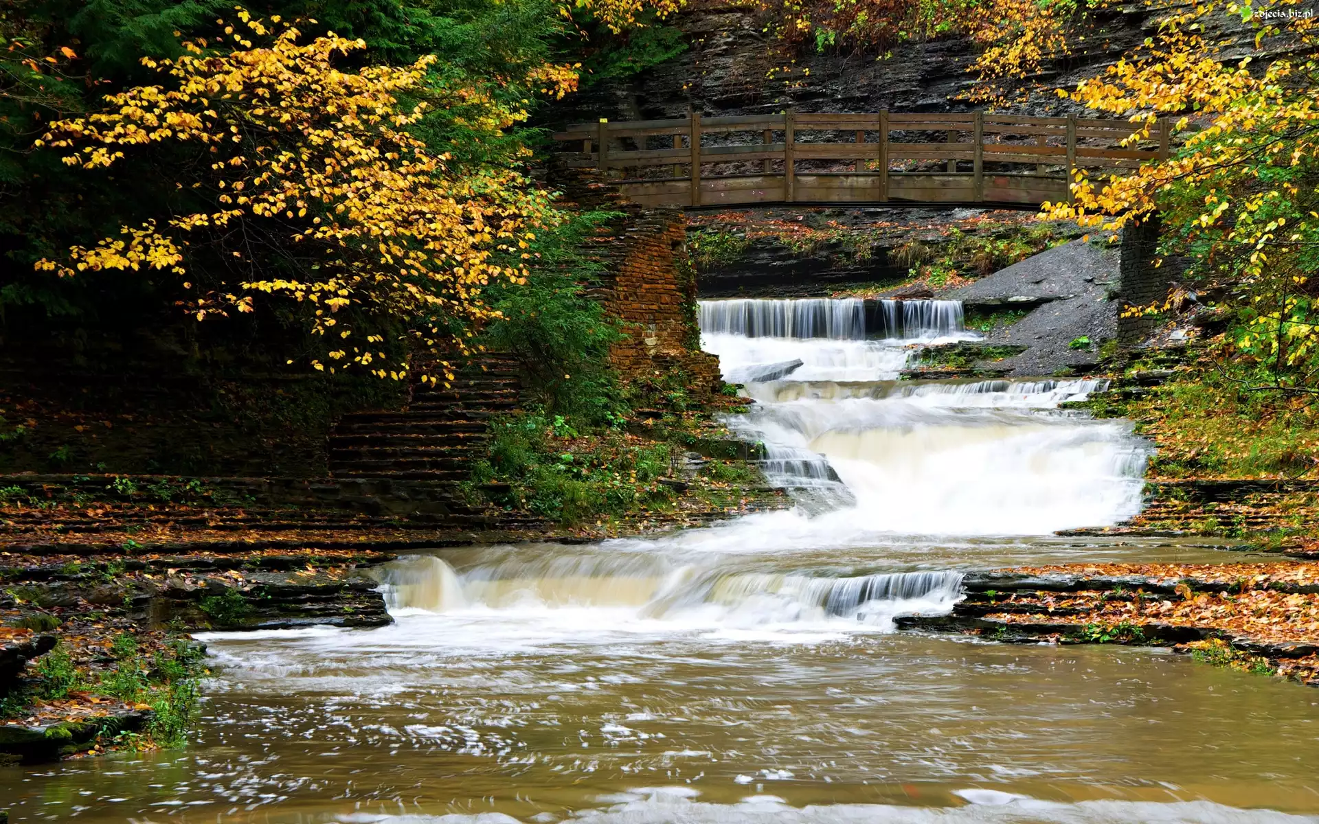 Zdjęcie Wodospad, Most, Rzeka, Skały, Las, Jesień