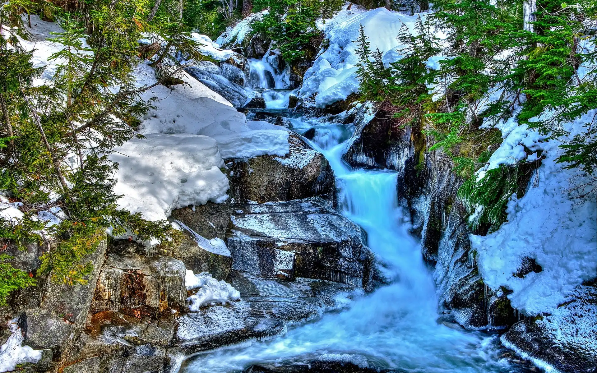 Zdjęcie Wodospad, Skały, Las, Zima