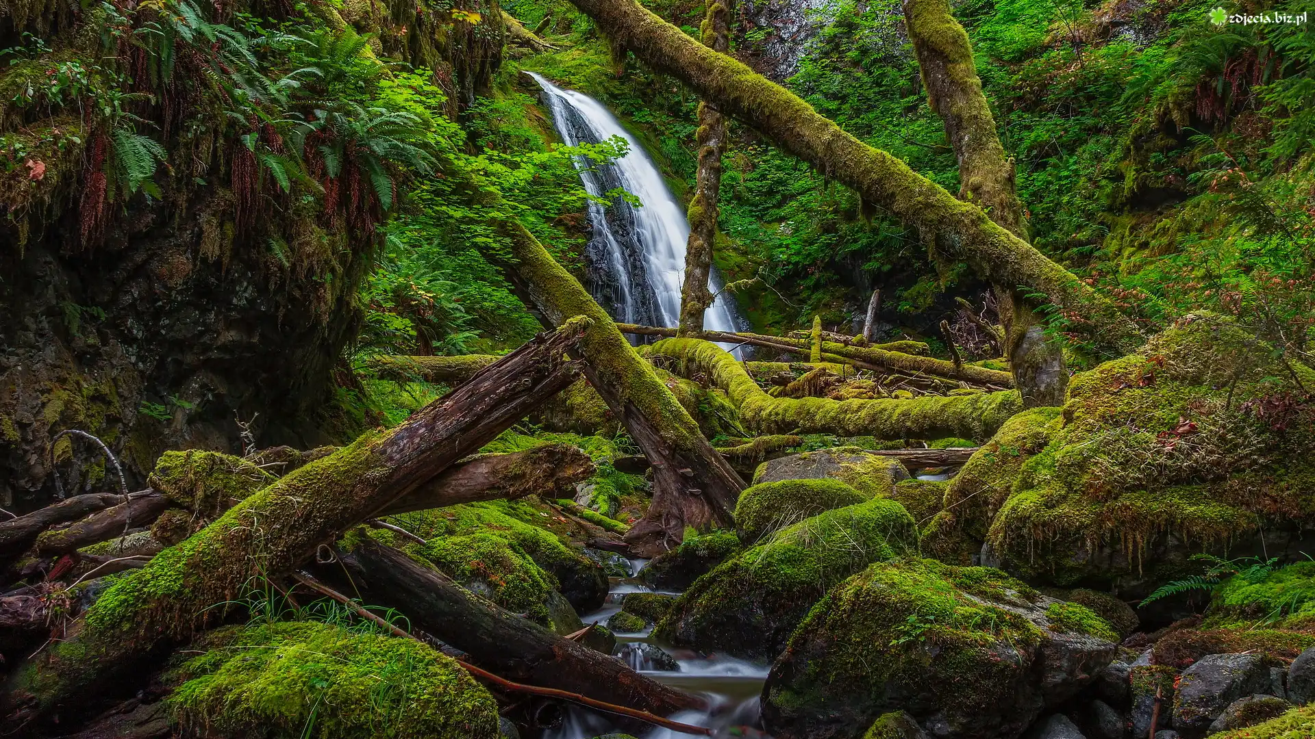 Zdjęcie Wodospad, Dry Creek Falls, Las państwowy, Gifford Pinchot, Drzewa, Omszałe, Kamienie, Powalone, Konary, Stan Waszyngton, Stany Zjednoczone |
