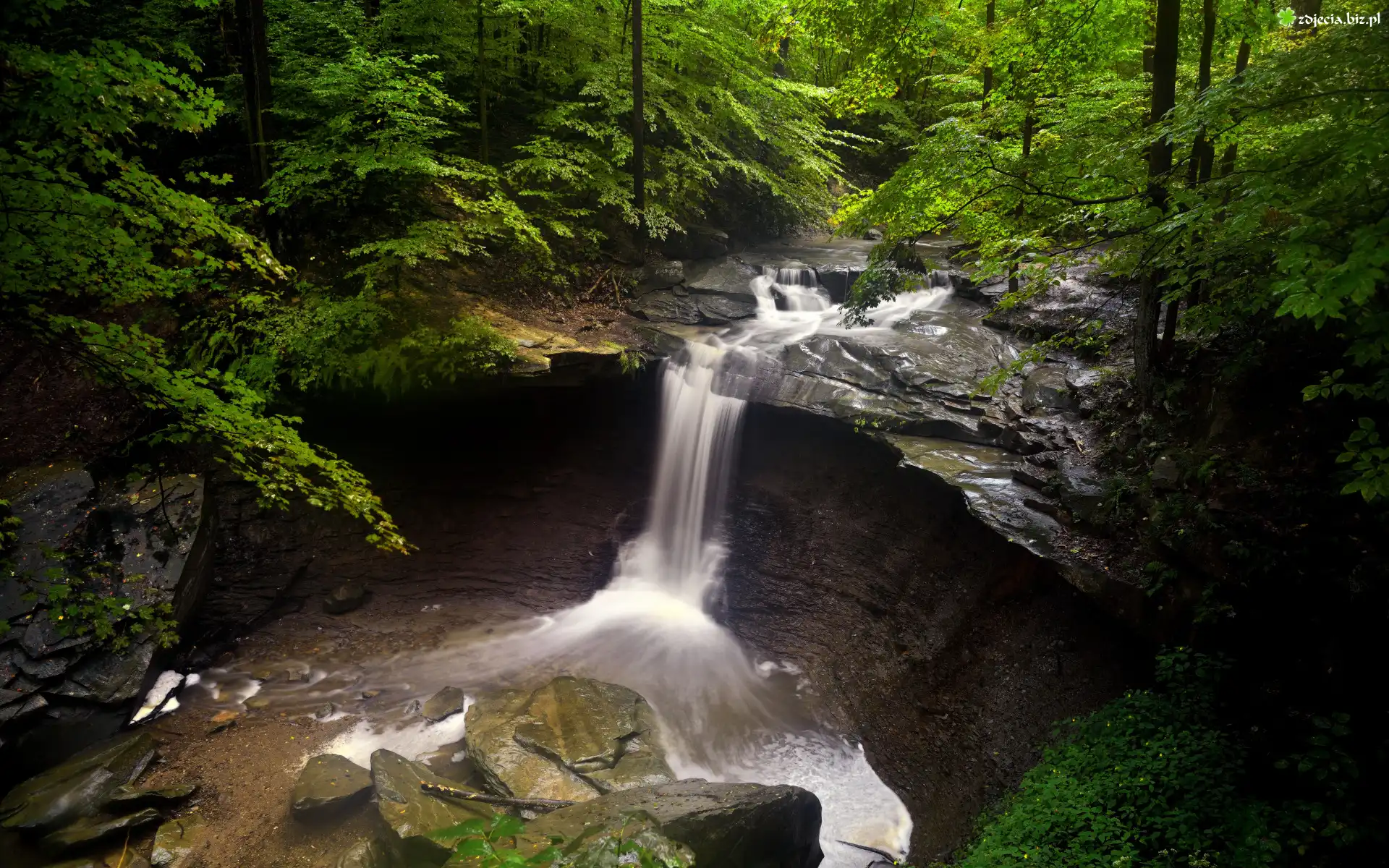 Zdjęcie Wodospad, Blue Hen Falls, Rzeka, Skała, Las, Drzewa, Kamienie, Park Narodowy Cuyahoga Valley, Stan Ohio, Stany Zjednoczone |