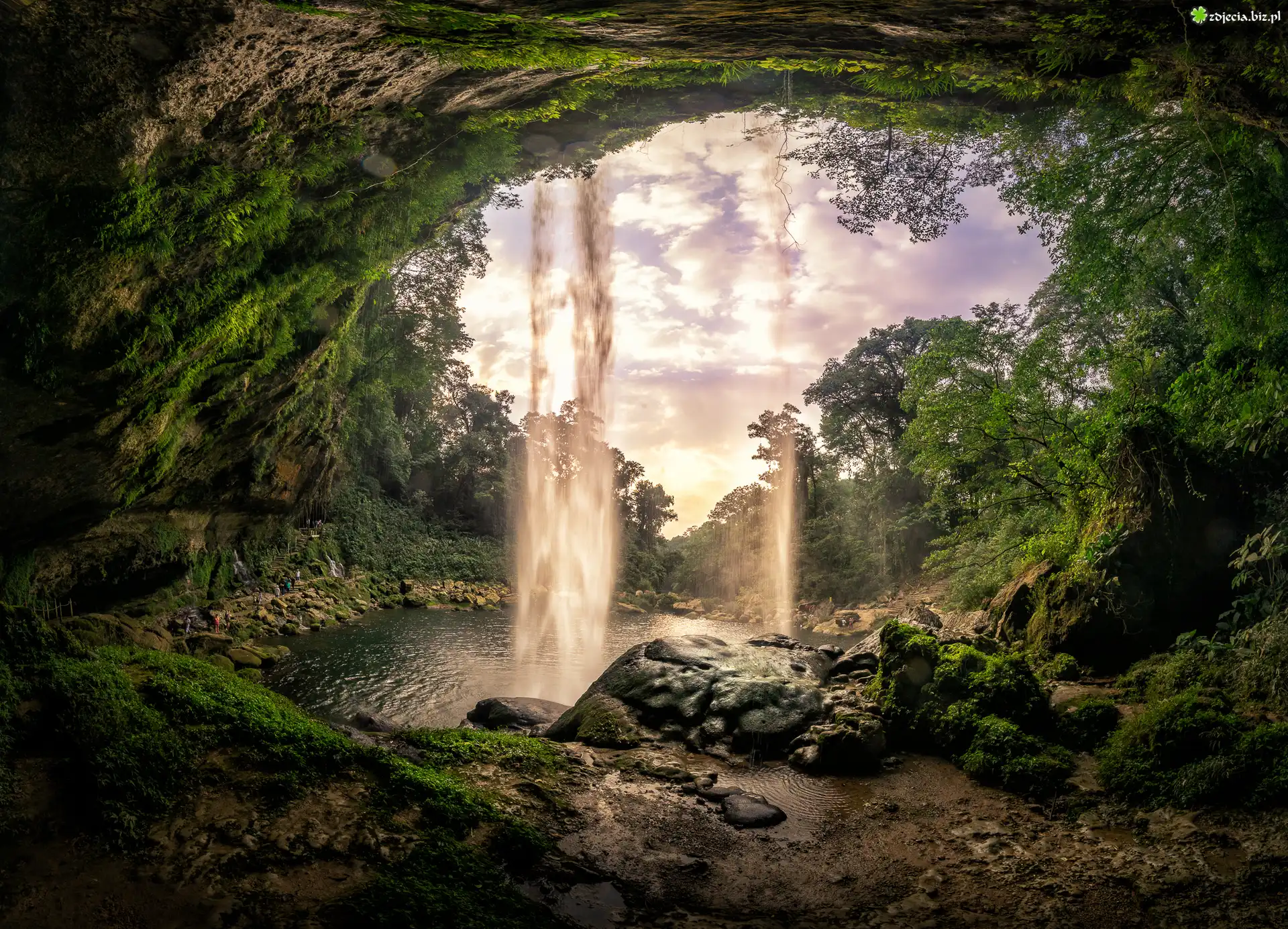 Zdjęcie Wodospad, Drzewa, Skały, Jaskinia, Rybie oko
