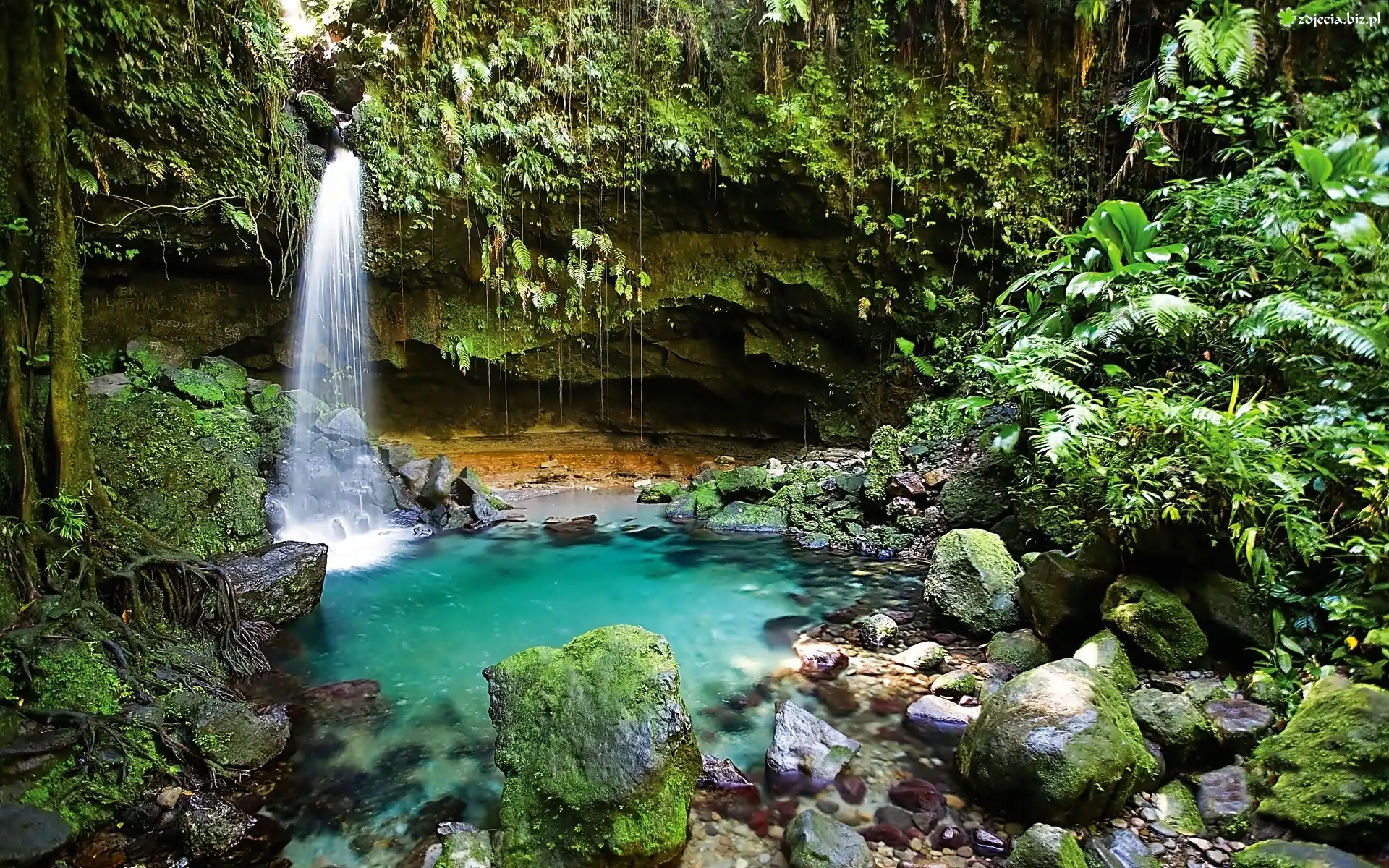 Zdjęcie Wodospad, Skały, Kamienie, Rzeka, Rośliny