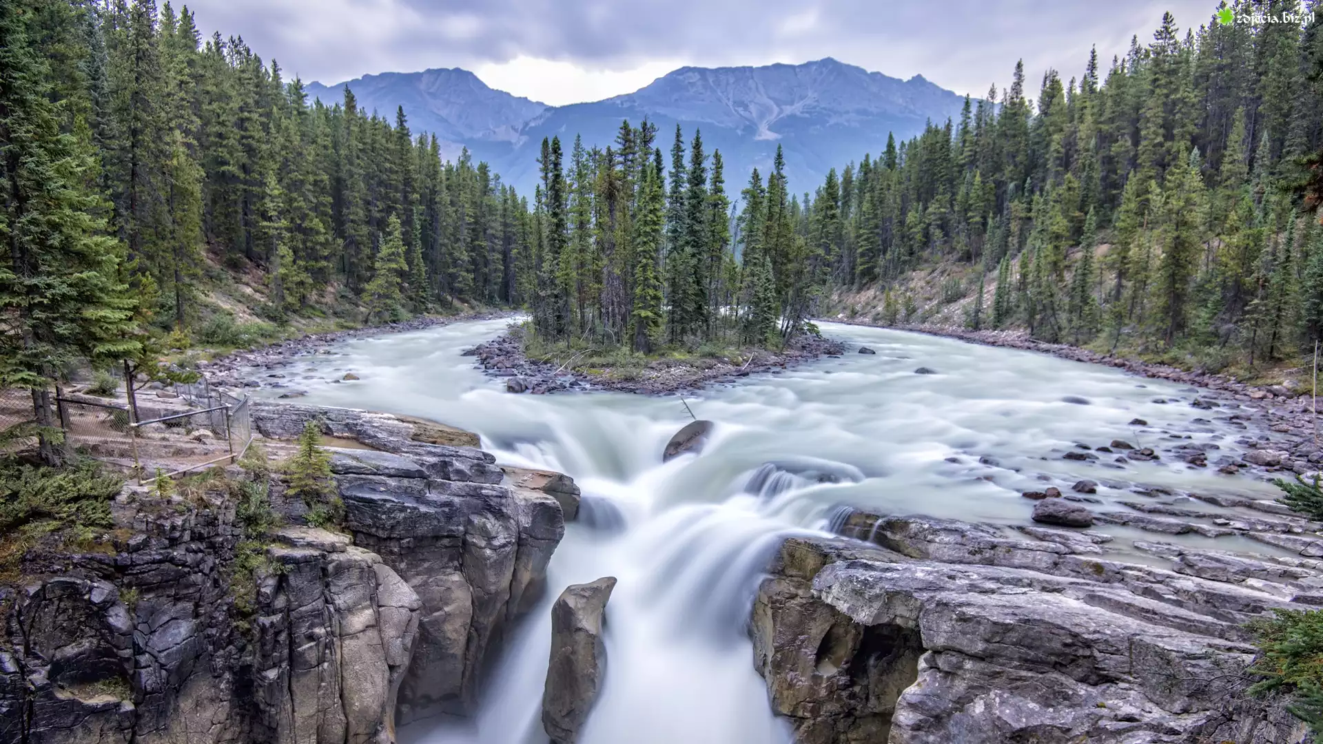 Zdjęcie Wodospad Sunwapta Falls, Rzeka Sunwapta, Park Narodowy Jasper, Góry, Drzewa, Prowincja Alberta, Kanada |