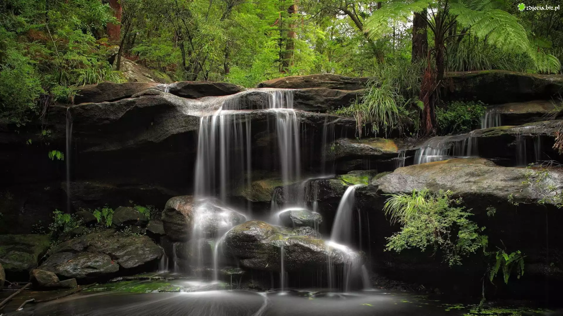 Zdjęcie Wodospad, Kaskada, Skały, Drzewa