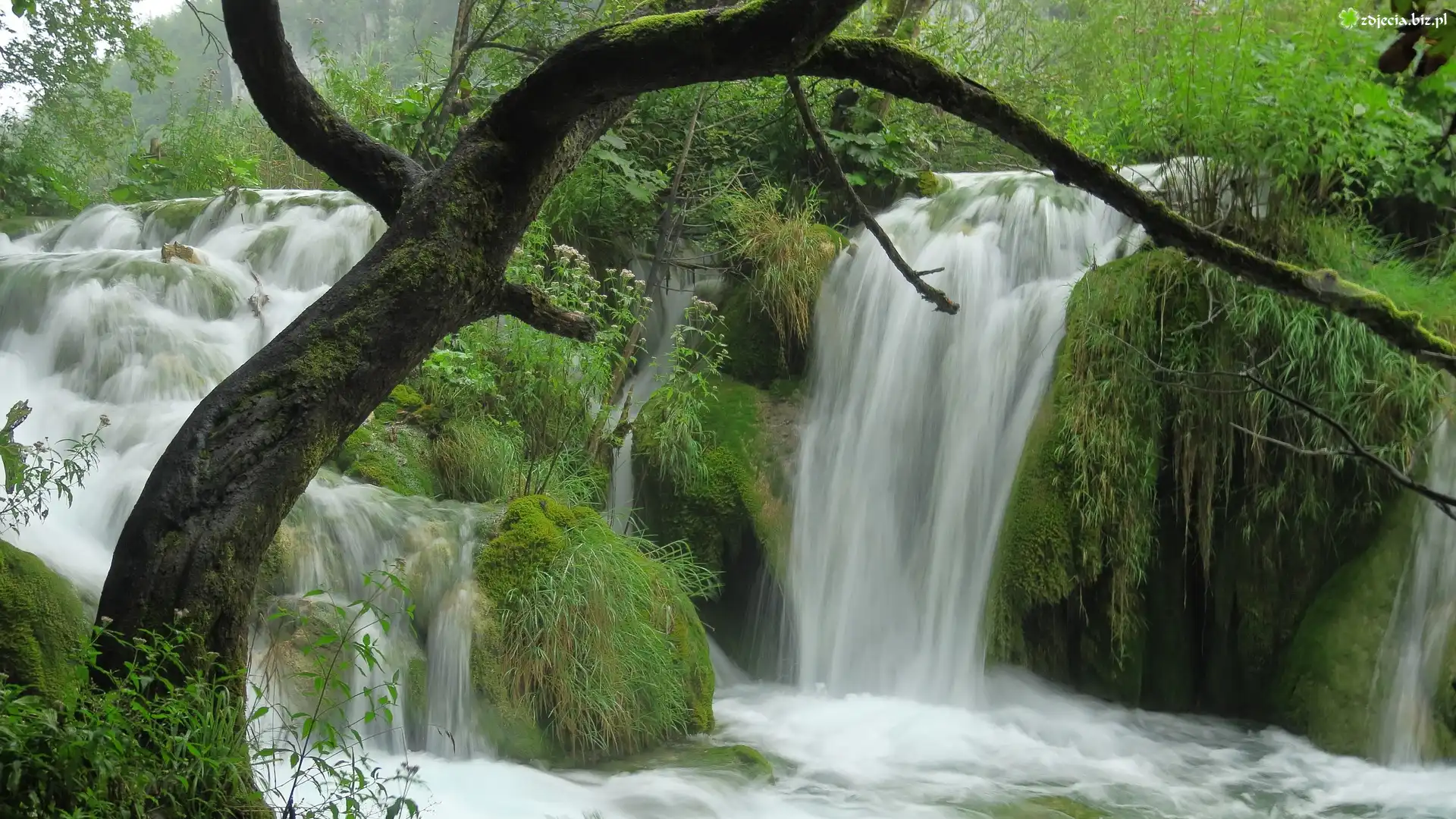 Zdjęcie Wodospad, Omszałe, Skały, Drzewo