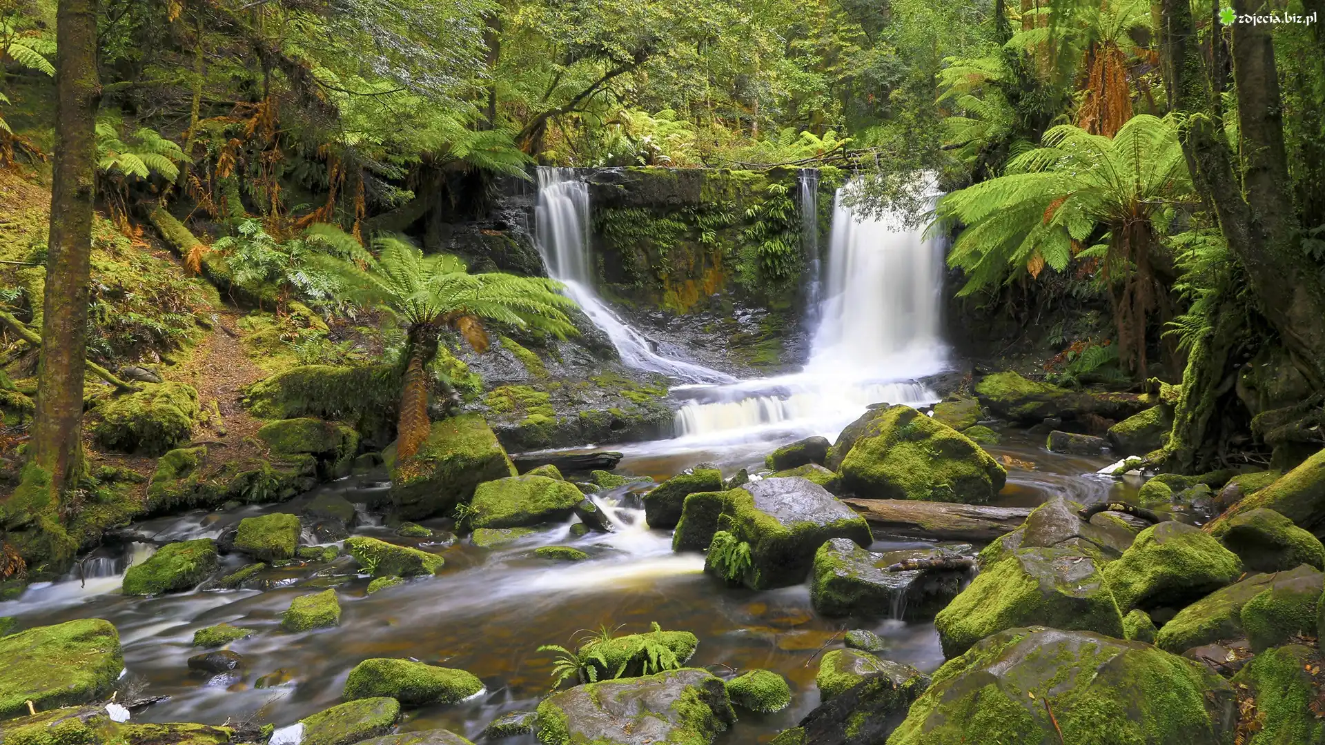 Zdjęcie Wodospad, Horseshoe Falls, Skała, Omszałe, Kamienie, Paprocie, Las, Rzeka, Park Narodowy Mount Field, Stan Tasmania, Australia |