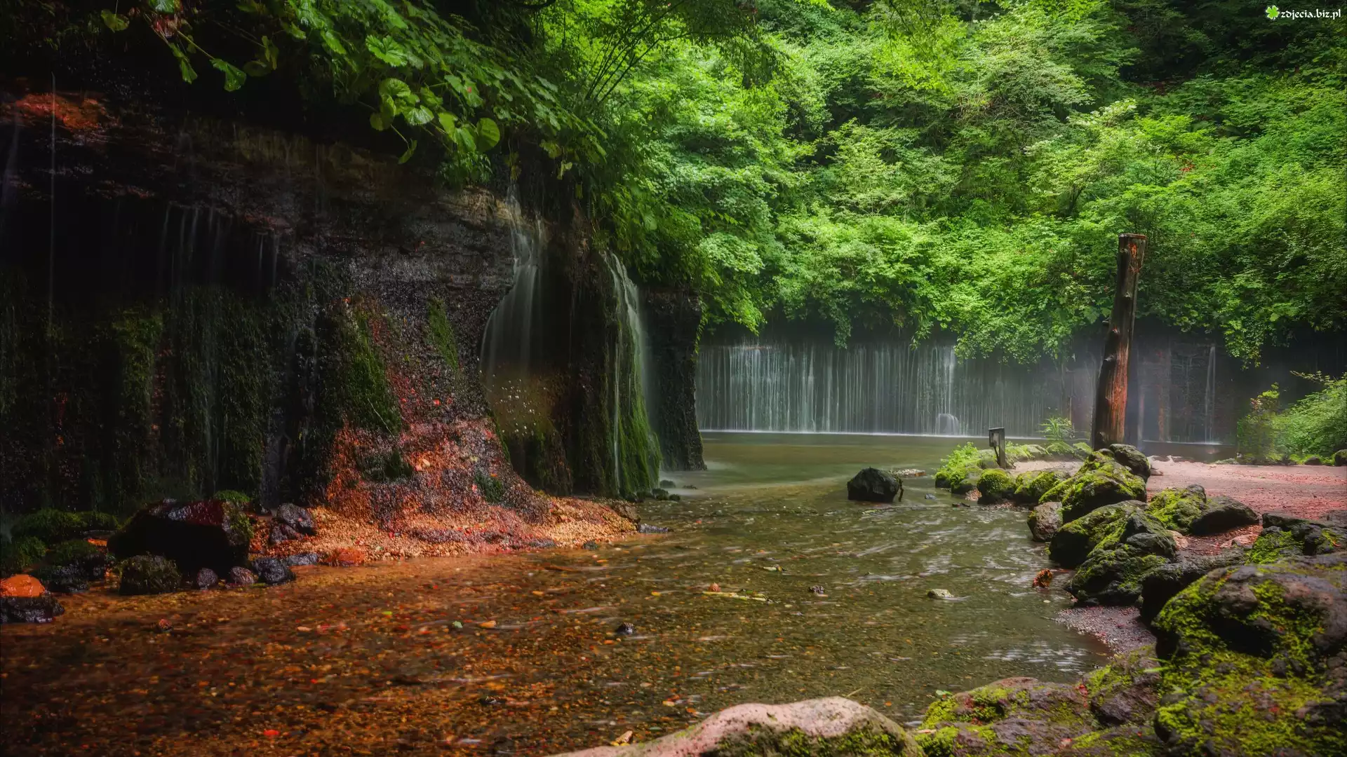Zdjęcie, Japonia, Karuizawa, Shiraito Falls, Wodospady, Rzeka, Skała