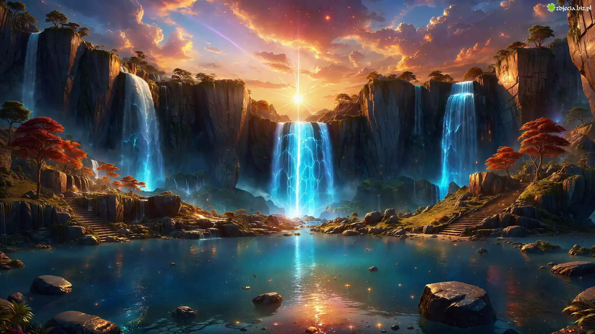 Zdjęcie Wodospady, Jezioro, Skały, Kamienie, Drzewa, Wschód słońca, Chmury, Grafika