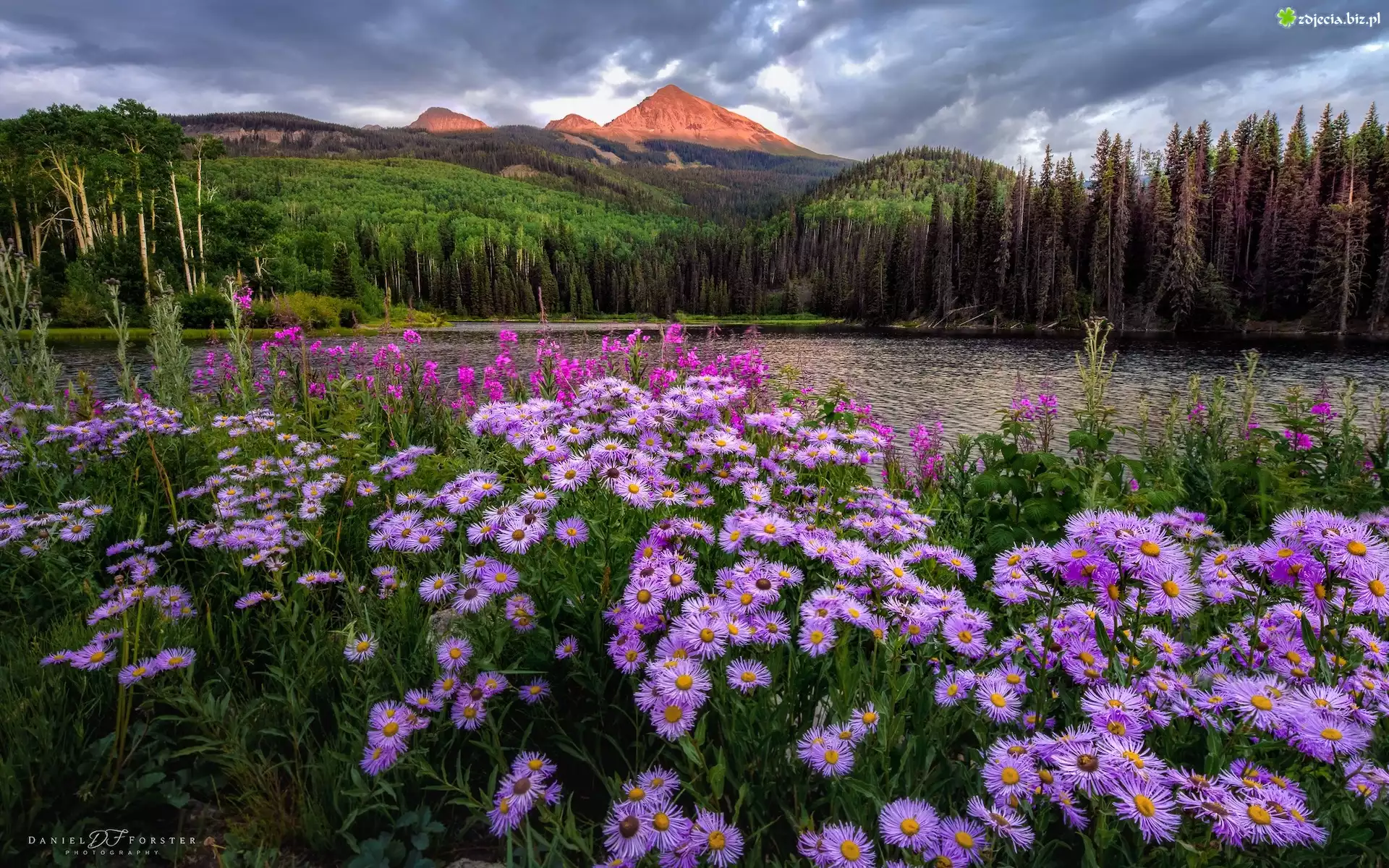 Zdjęcie Stany Zjednoczone, Kolorado, Telluride, Góry, Jezioro, Woods Lake, Kwiaty, Astry, Drzewa