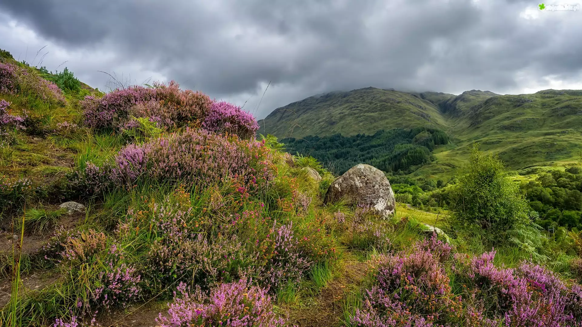 Zdjęcie Wrzosowisko, Góry, Chmury, Wrzosy, Kwiaty, Kamień, Głaz