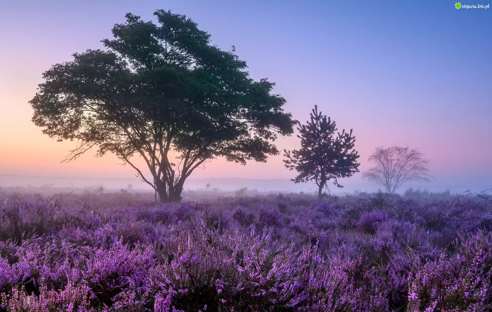 Zdjęcie Wrzosy, Wrzosowisko, Drzewa, Mgła