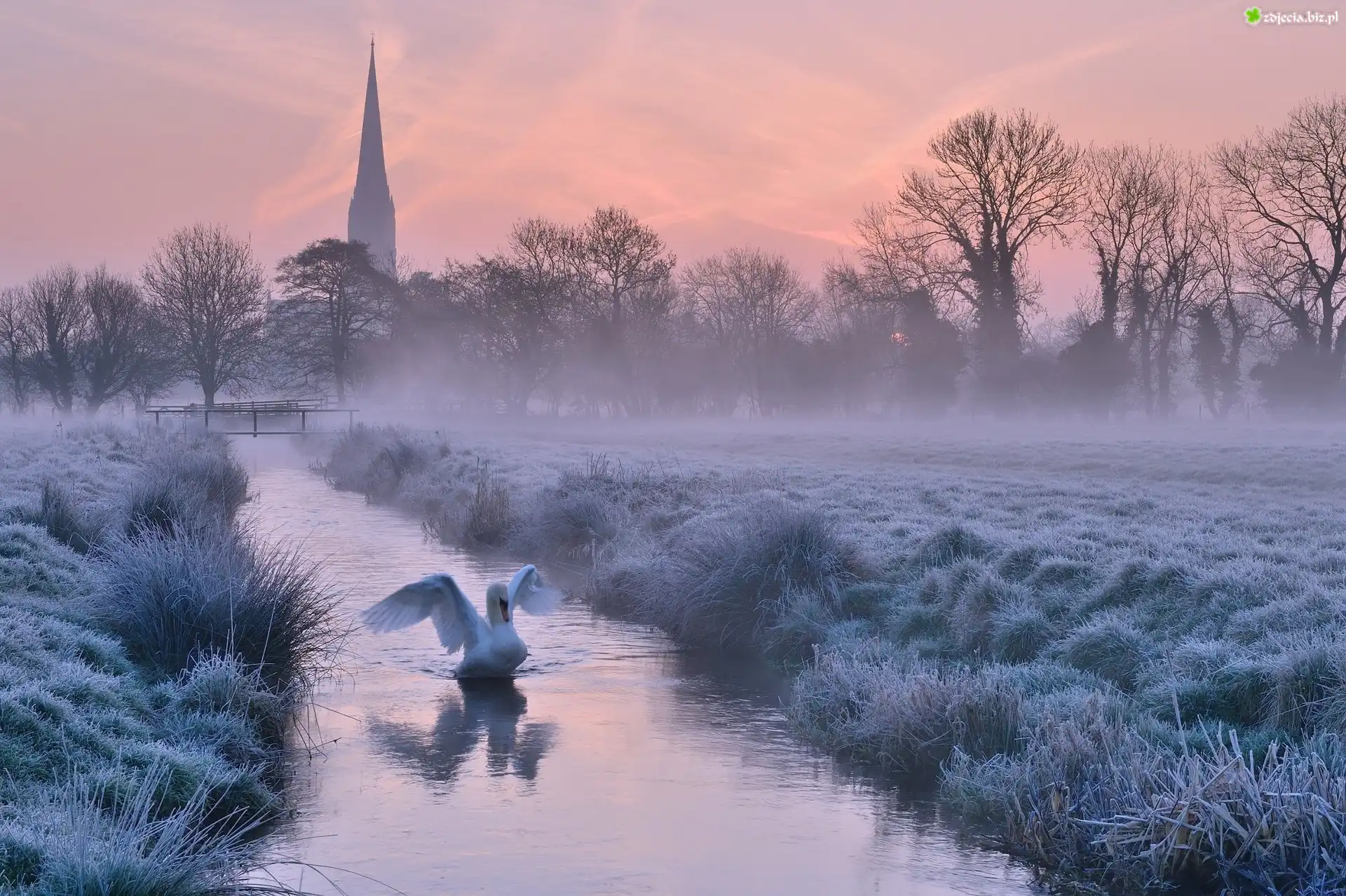 Zdjęcie Wschód Słońca, Mgła, Rzeka, Łabędź, Kościół