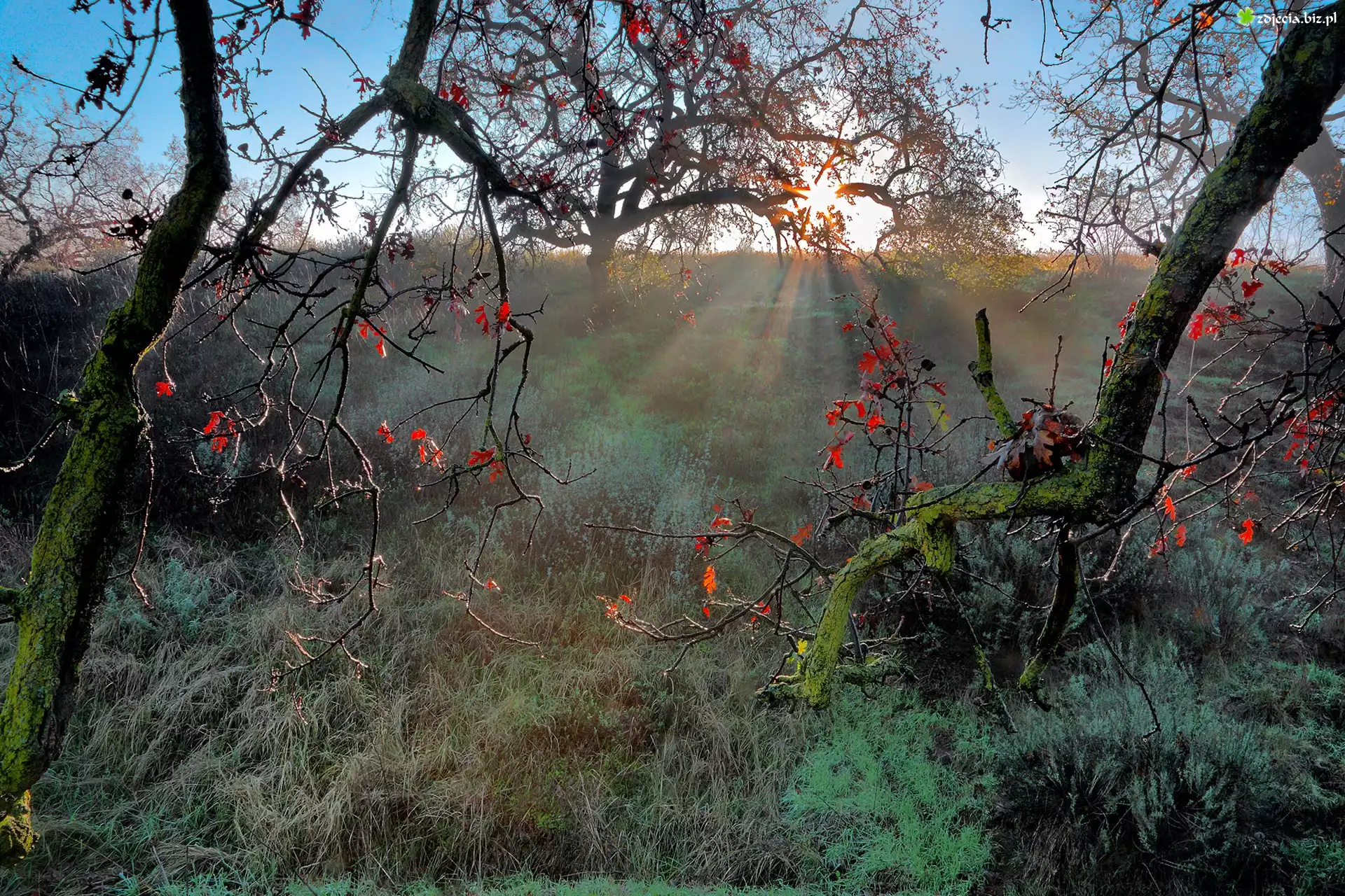 Zdjęcie Wschód Słońca, Łąka, Drzewa