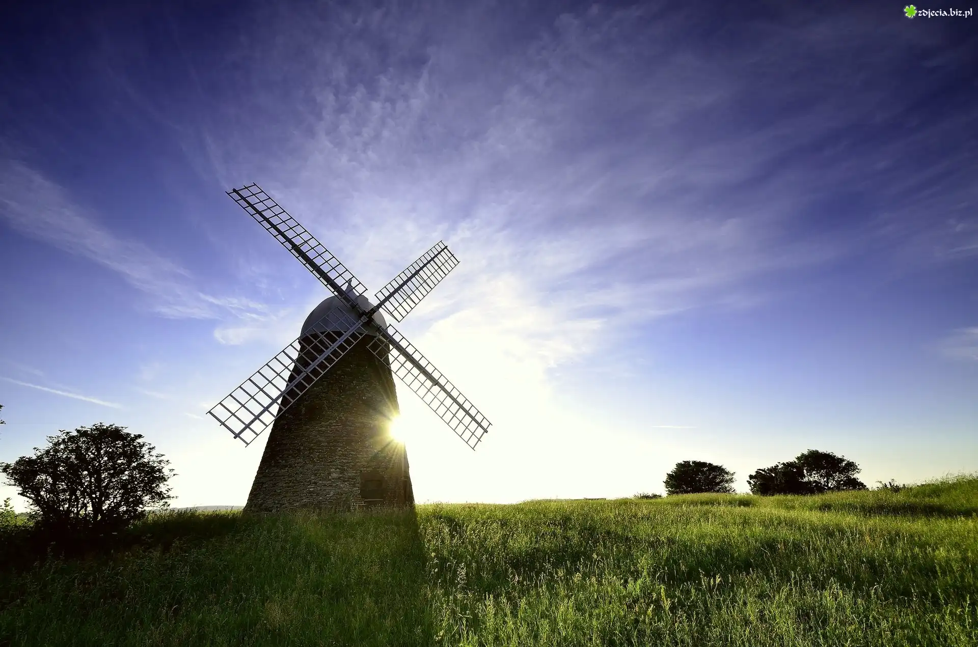 Zdjęcie Wschód, Słońca, Łąka, Wiatrak