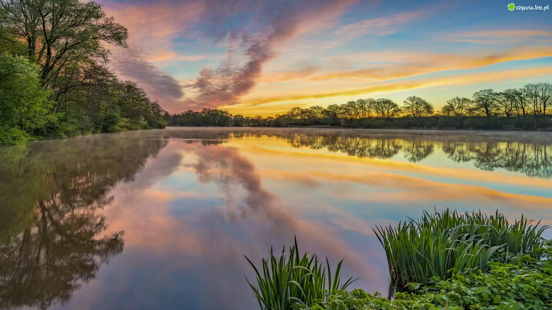 Zdjęcie, Wschód słońca, Chmury, Drzewa, Jezioro Sterenbachsee, Dolina Wittlicha, Niemcy