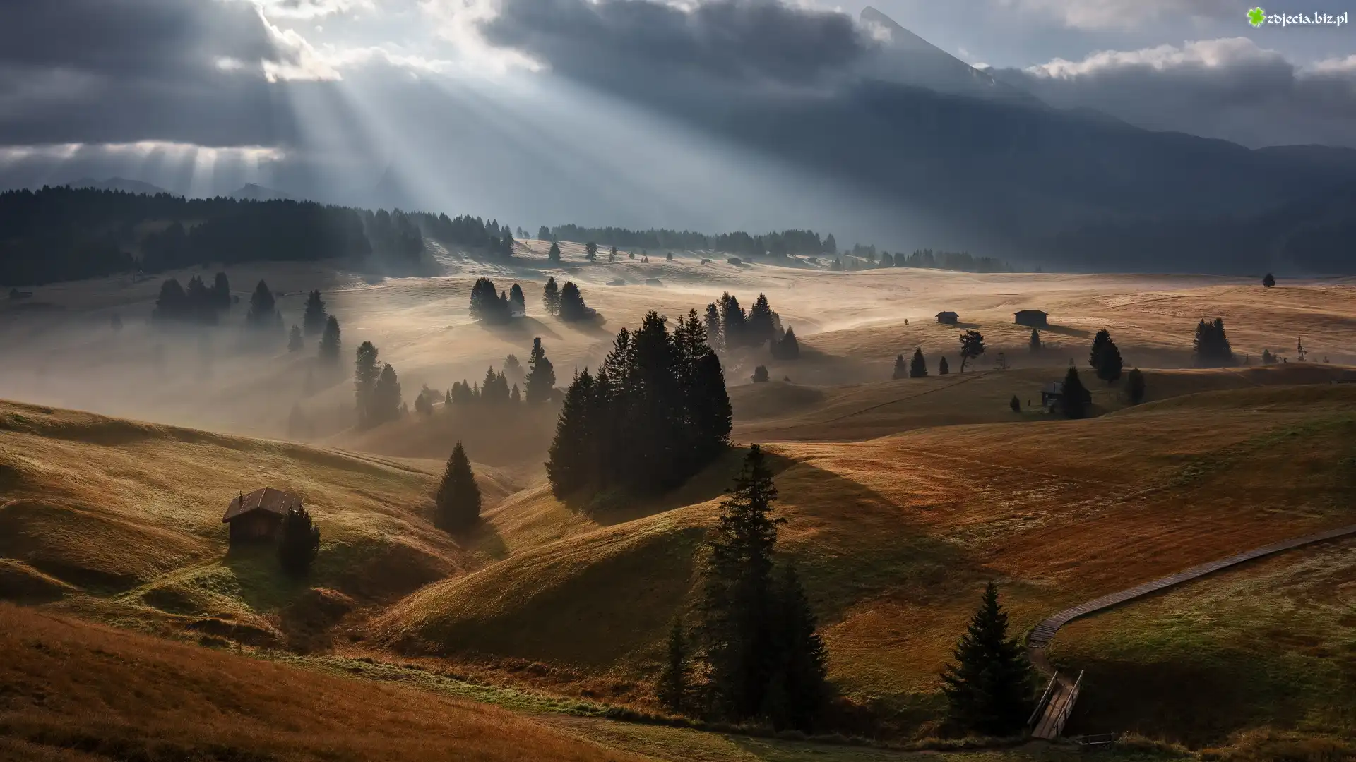 Zdjęcie Wschód słońca, Przebijające światło, Chmury, Dolina Val Gardena, Góry, Dolomity, Płaskowyż Seiser Alm, Domy, Drzewa, Włochy |