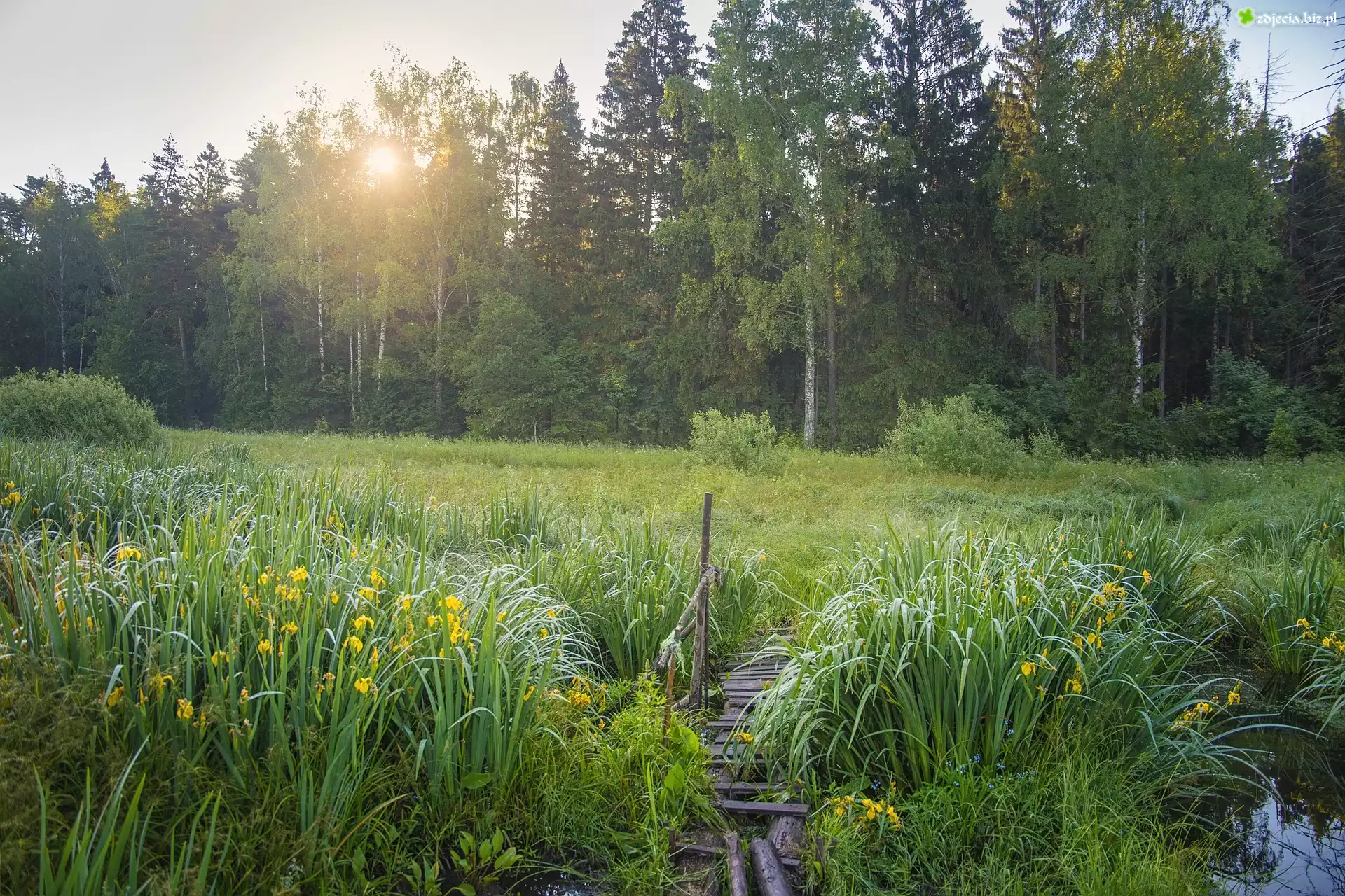 Zdjęcie Irys, Mokradła, Las, Wschód słońca, Drzewa