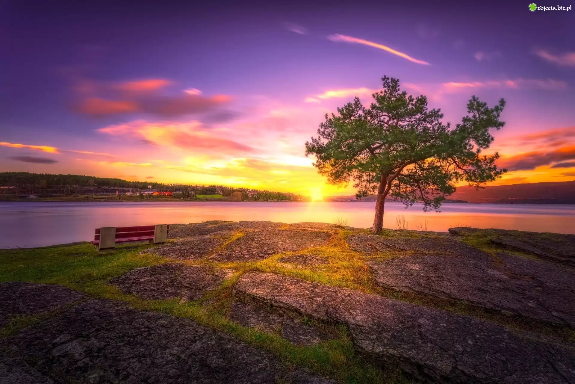 Zdjęcie, Wschód słońca, Rzeka, Drzewo, Ławka