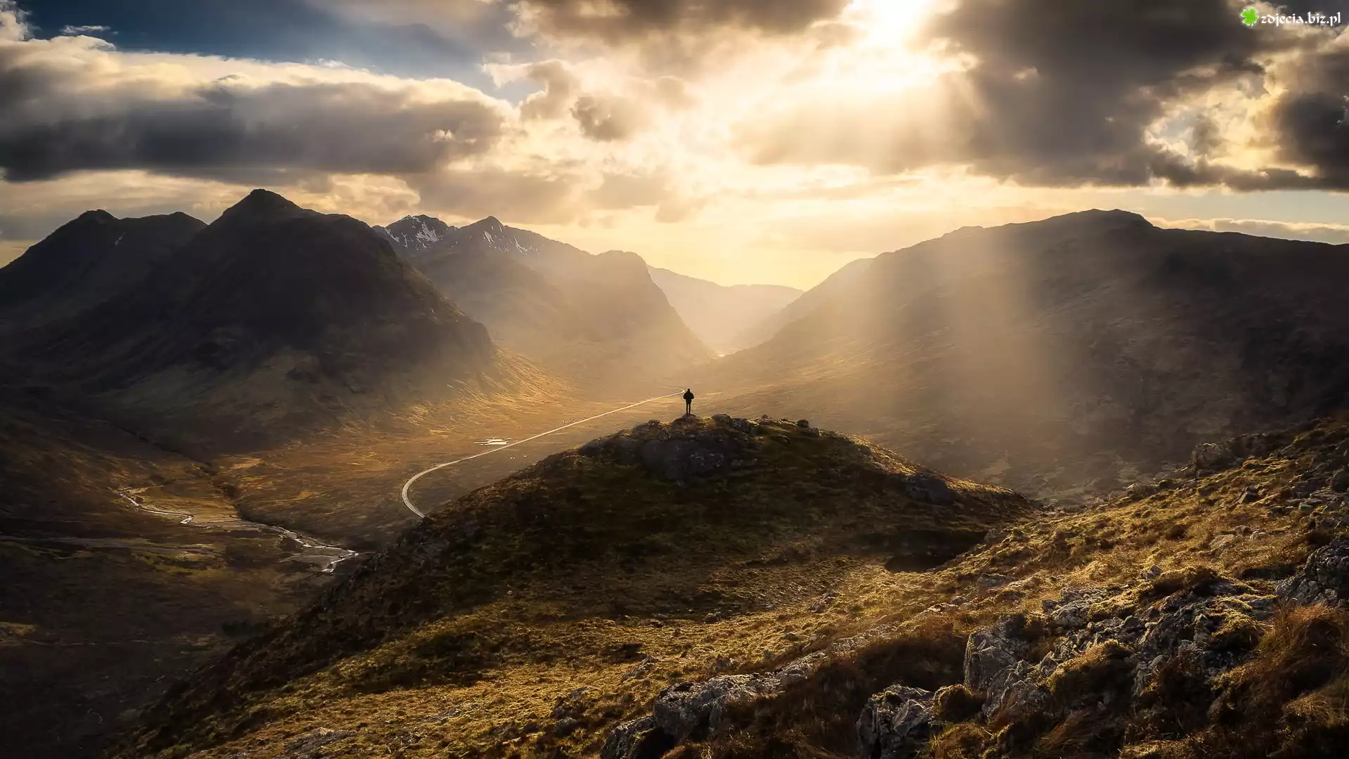 Zdjęcie Góry, Wschód słońca, Chmury, Dolina, Wzgórze, Człowiek