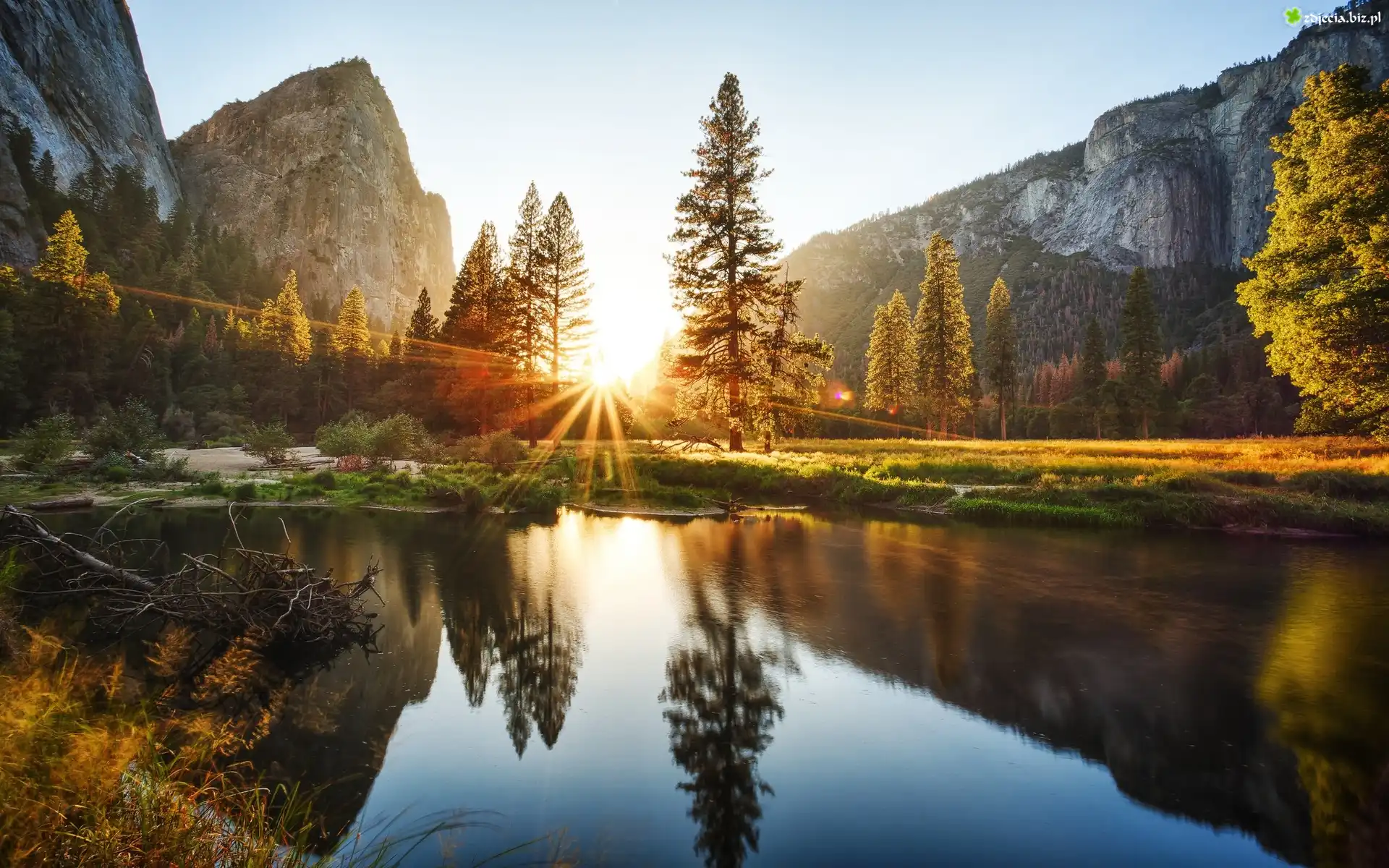 Zdjęcie, Wschód słońca, Jezioro, Góry, Odbicie