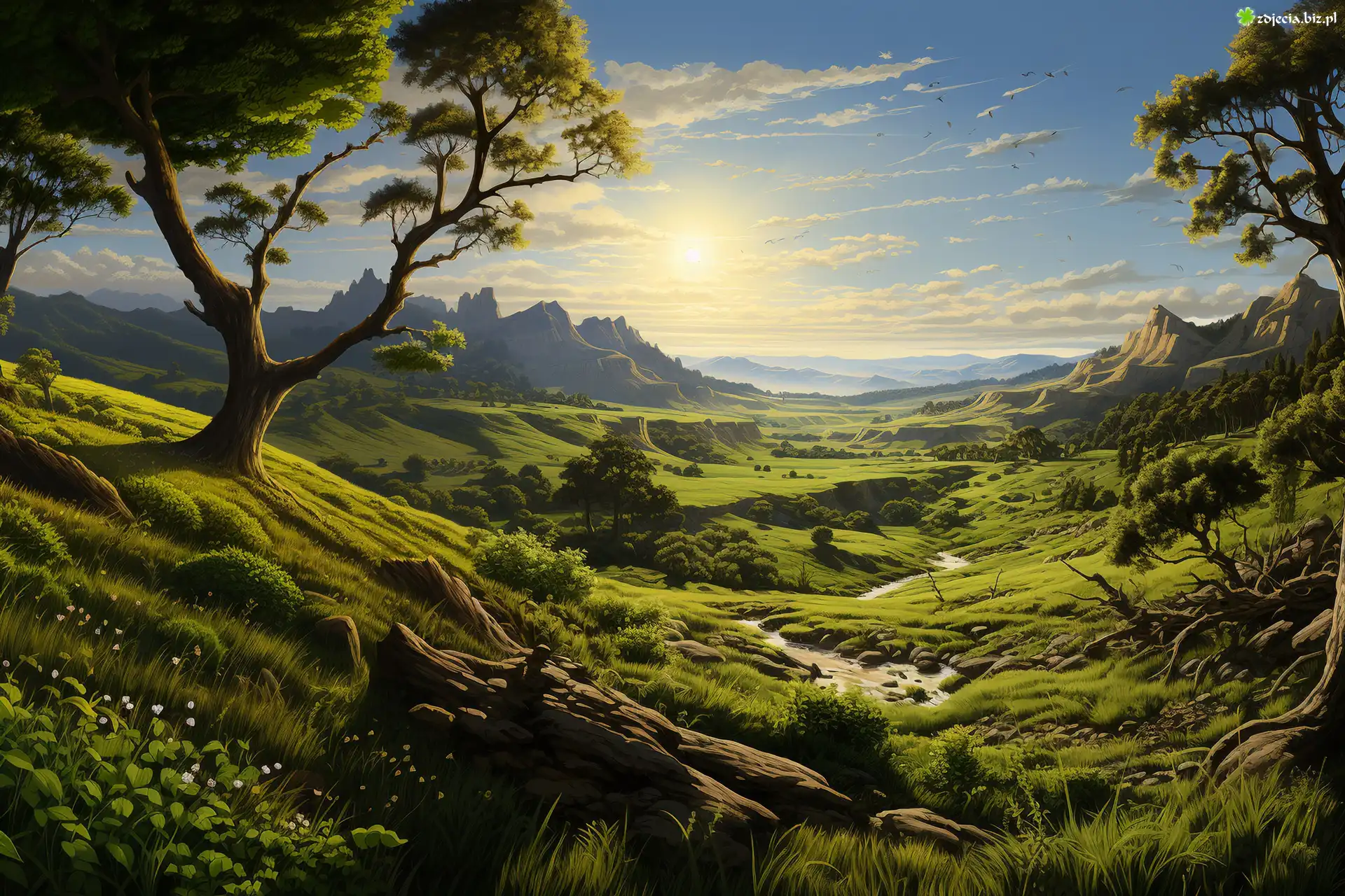 Zdjęcie Dolina, Drzewa, Góry, Wschód słońca, Grafika