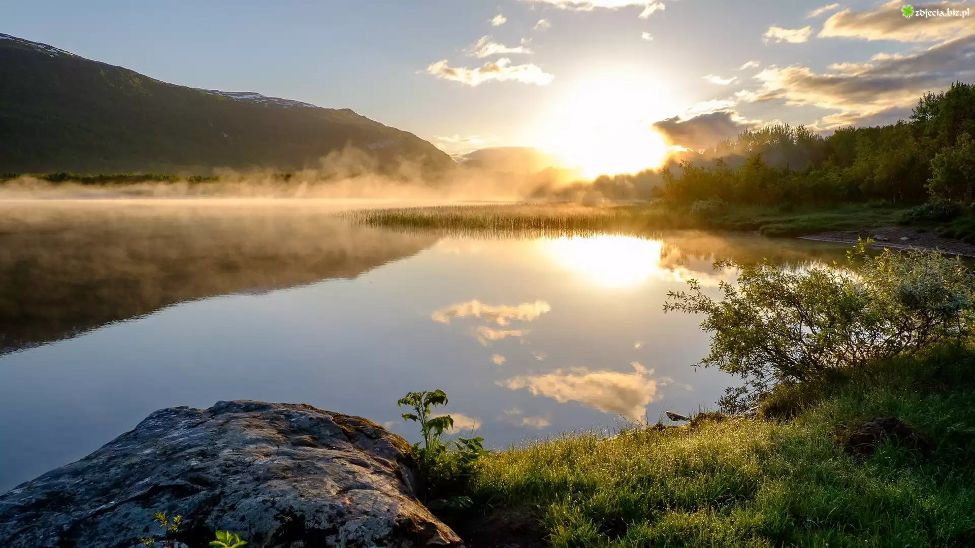 Zdjęcie Jezioro, Wschód słońca, Mgła, Wzgórza, Drzewa, Chmury