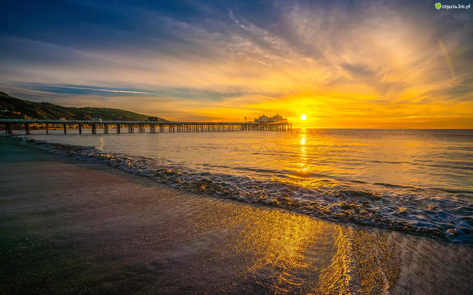 Zdjęcie Wschód słońca, Morze, Molo, Plaża, Malibu, Kalifornia, Stany Zjednoczone