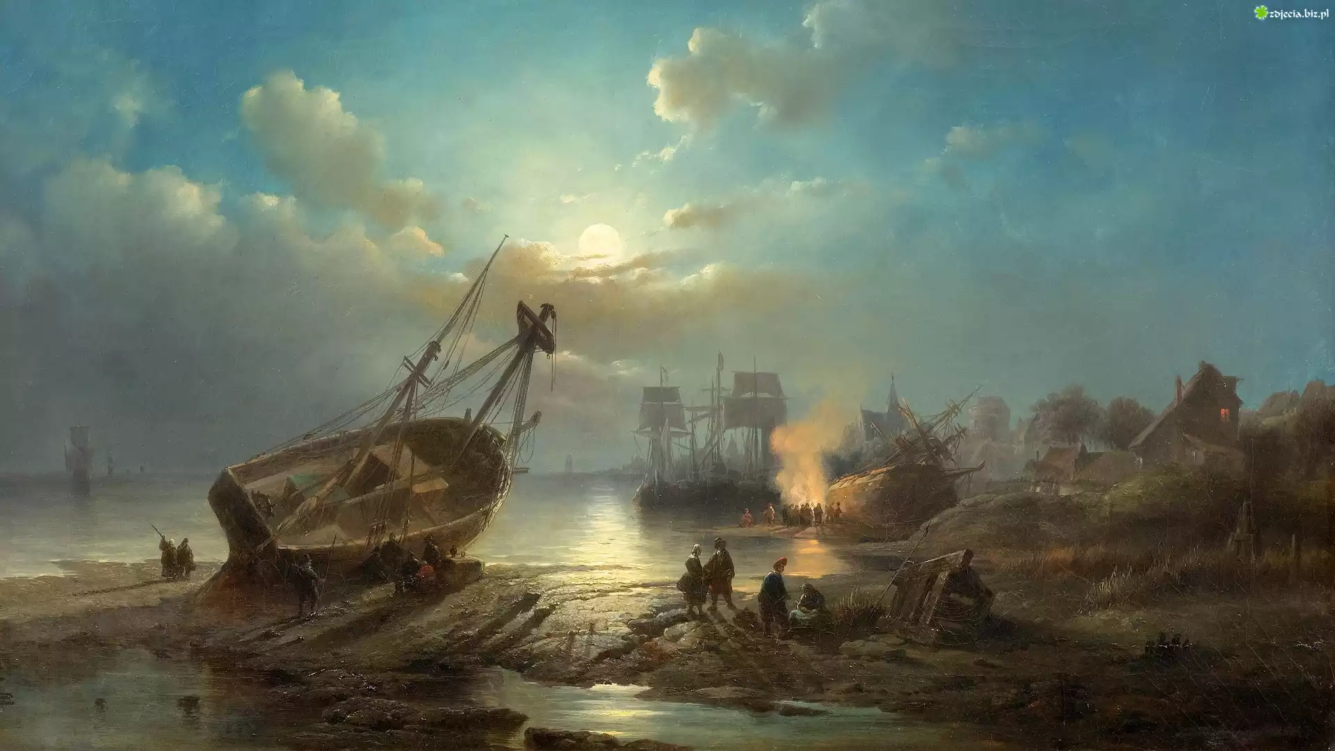 Zdjęcie Malarstwo, Obraz, Henri Adolphe Schaep, Wschód słońca, Jezioro, Żaglowce, Mgła, Ludzie, Domy |