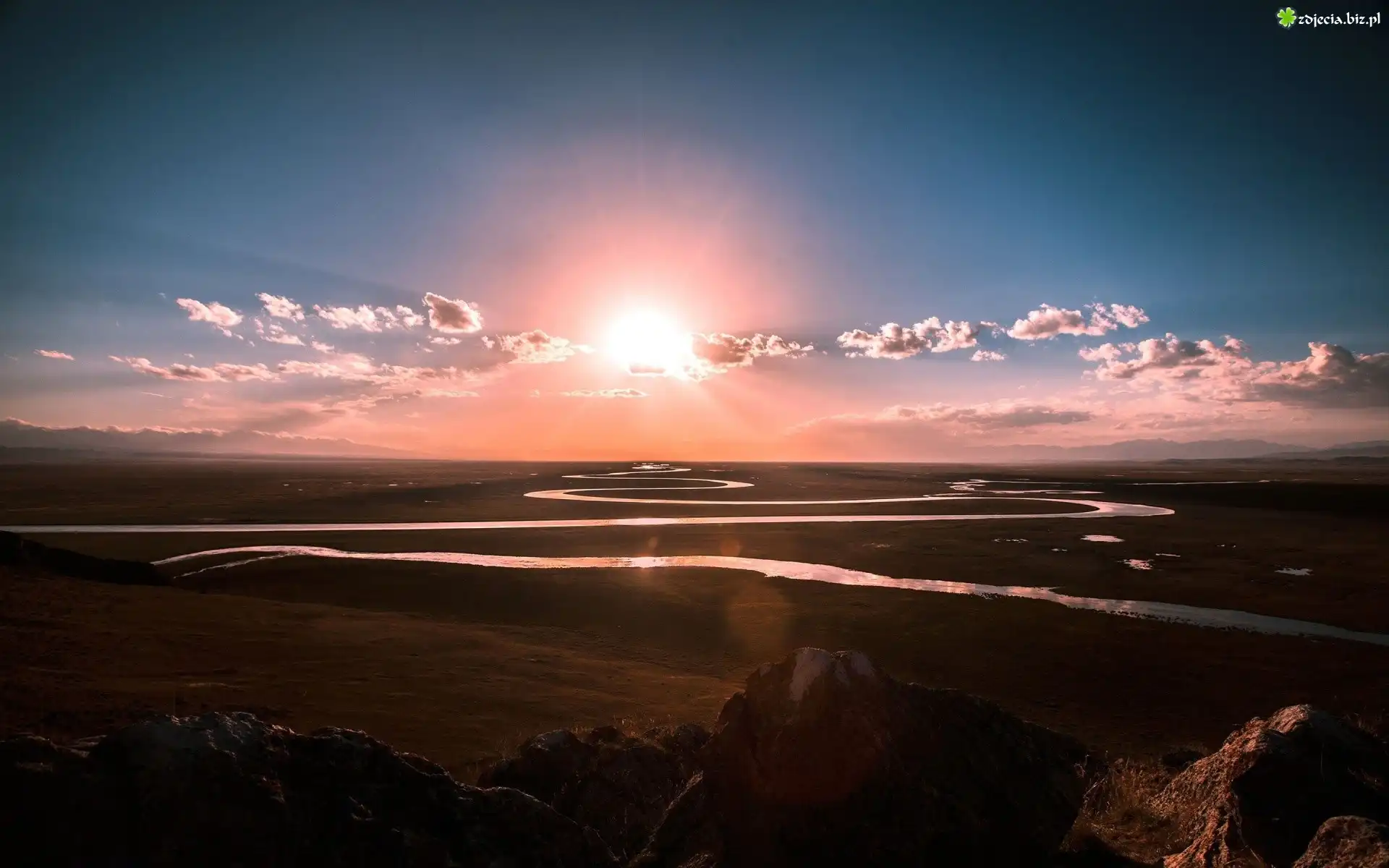 Zdjęcie Wschód, Słońca, Łąki, Rzeka, Skały