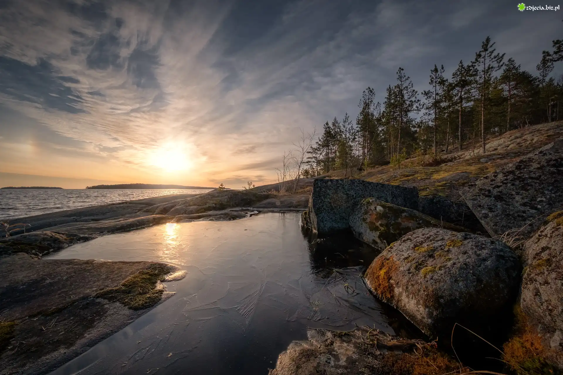 Zdjęcie Wschód słońca, Jezioro, Skały, Skarpa, Drzewa