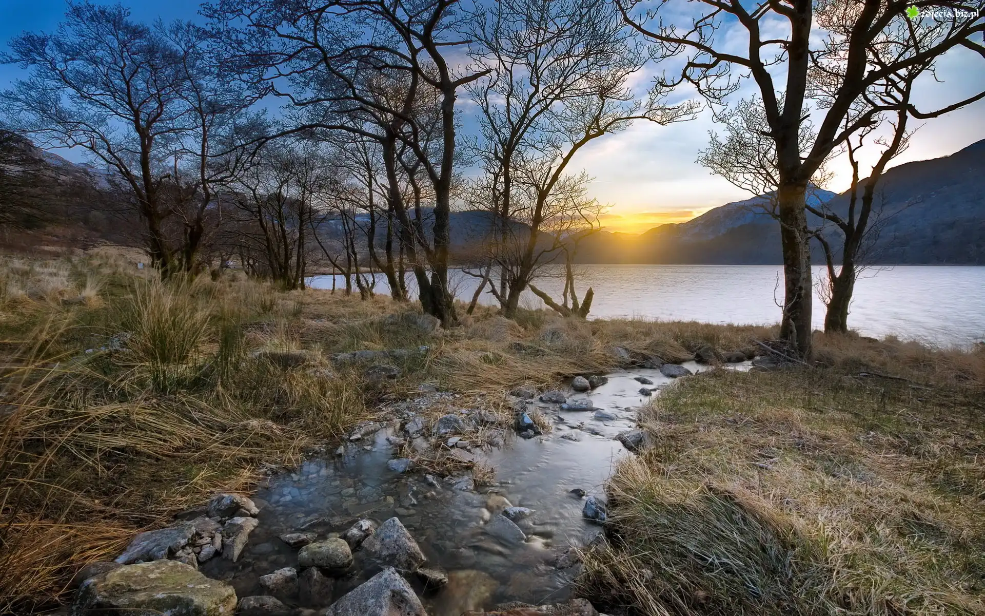Zdjęcie, Wschód, Słońca, Jezioro, Strumyk, Drzewa