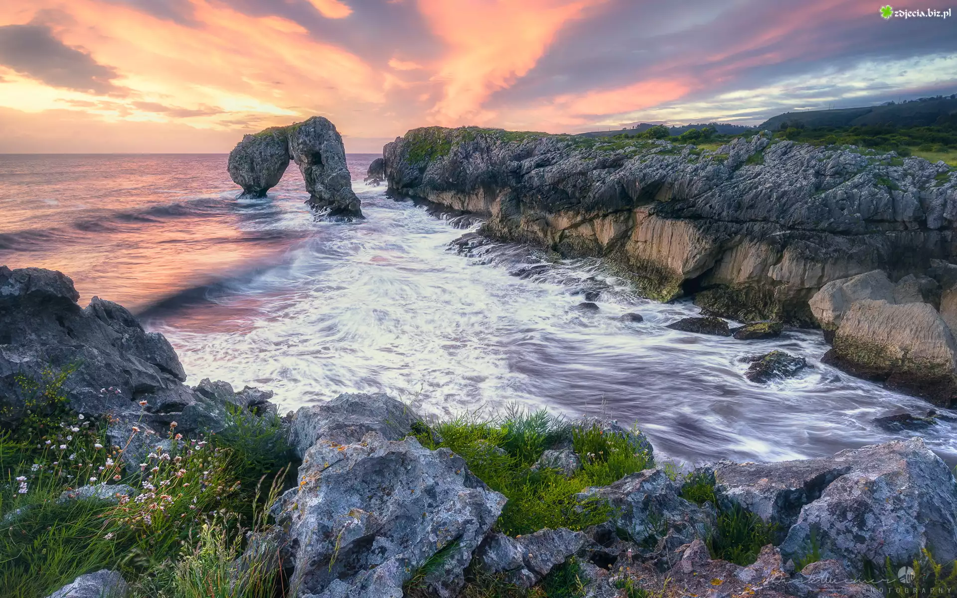 Zdjęcie Wschód słońca, Morze, Łuk skalny, Skały, Playa de La Huelga, Villahormes, Asturia, Hiszpania |