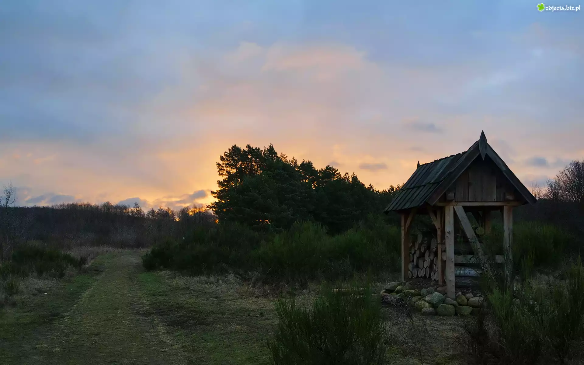 Zdjęcie Wschód słońca, Poranek, Domek, Wiatka, Drewno