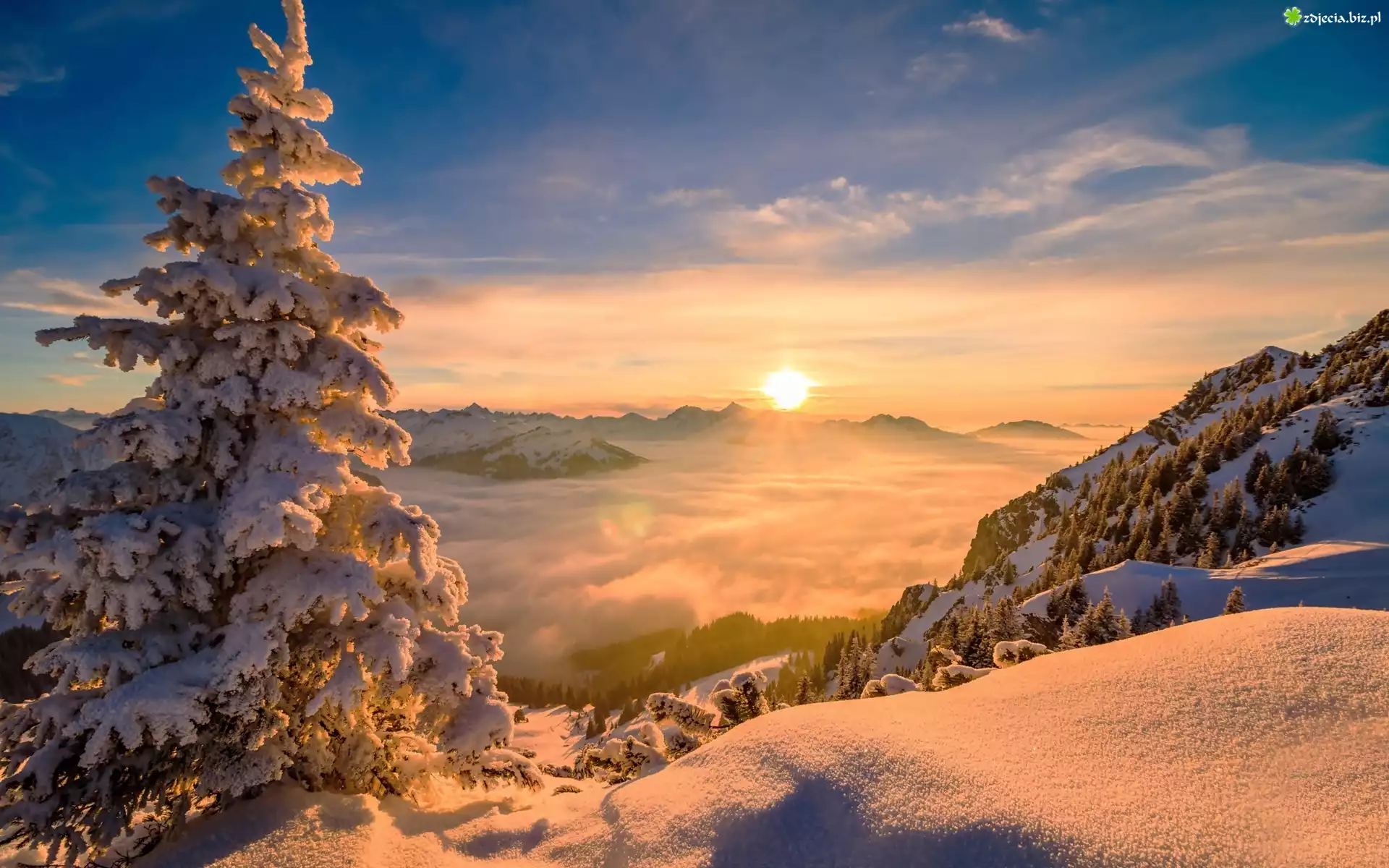 Zdjęcie Zima, Wschód słońca, Góry, Mgła, Ośnieżone, Drzewo, Świerk