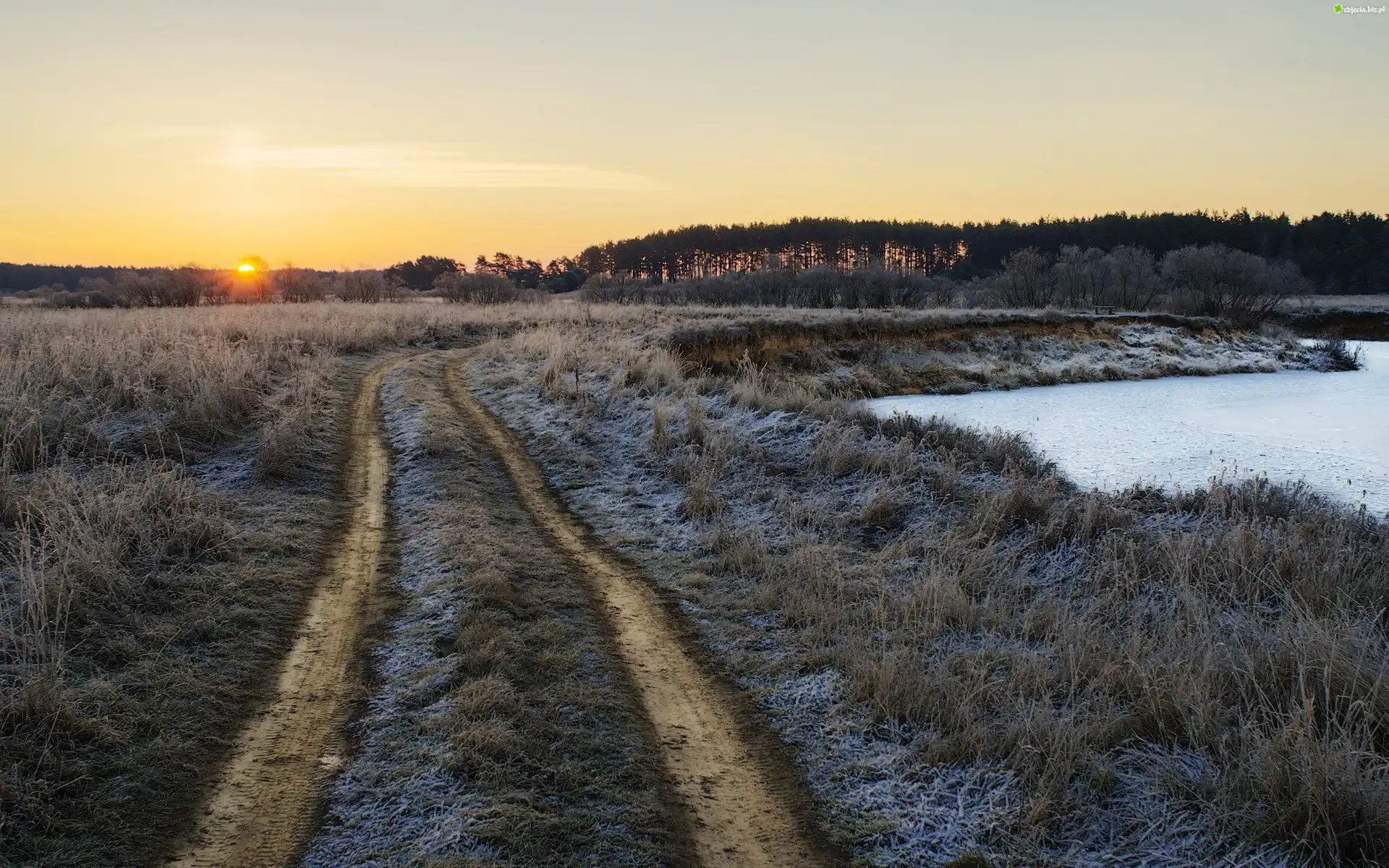 Zdjęcie Wschód, Słońca, Jezioro, Droga, Zeschłe, Trawy